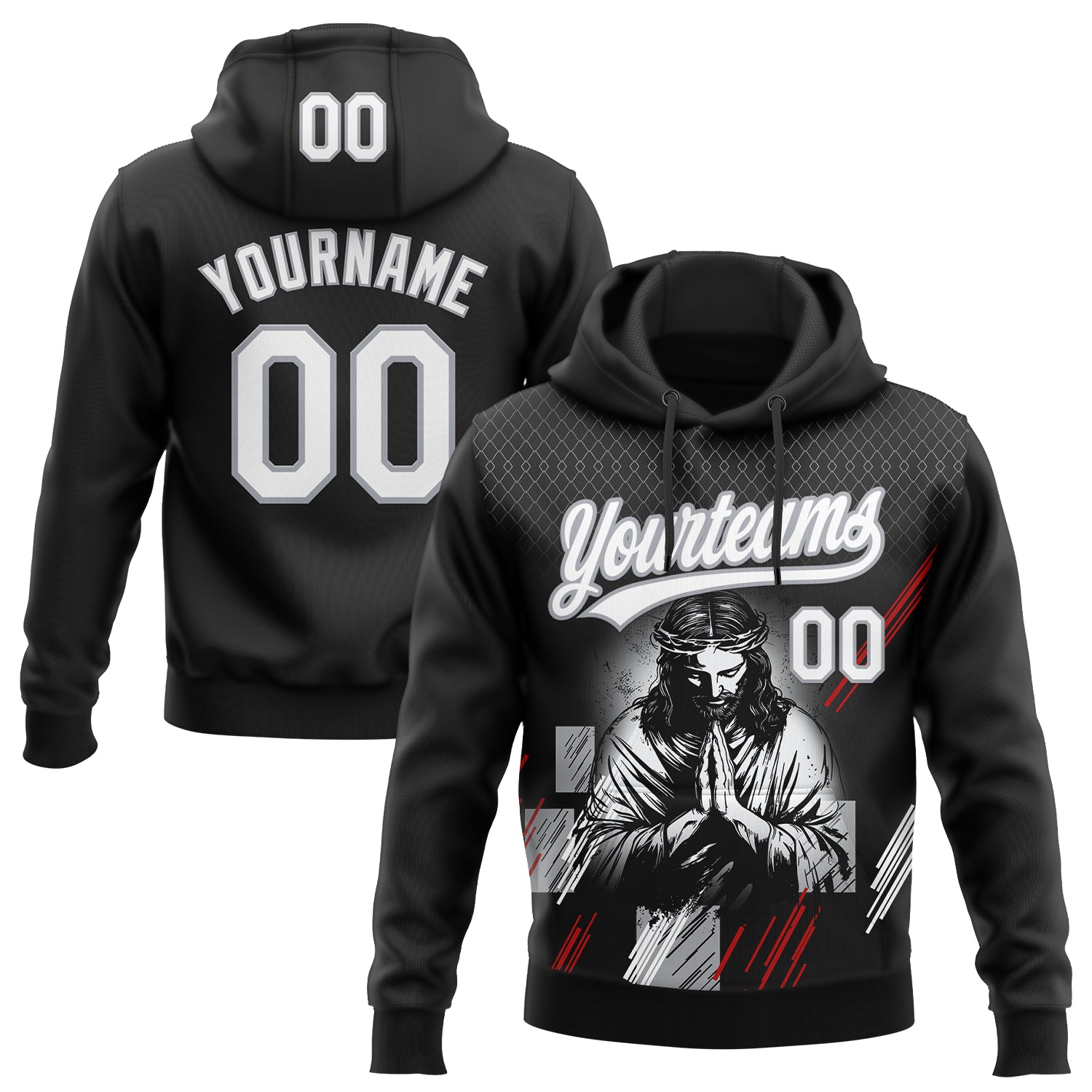 Custom Stitched Black White Gray-Red 3D Pattern Design Religion Jesus Christ Pullover Sweatshirt Hoodie