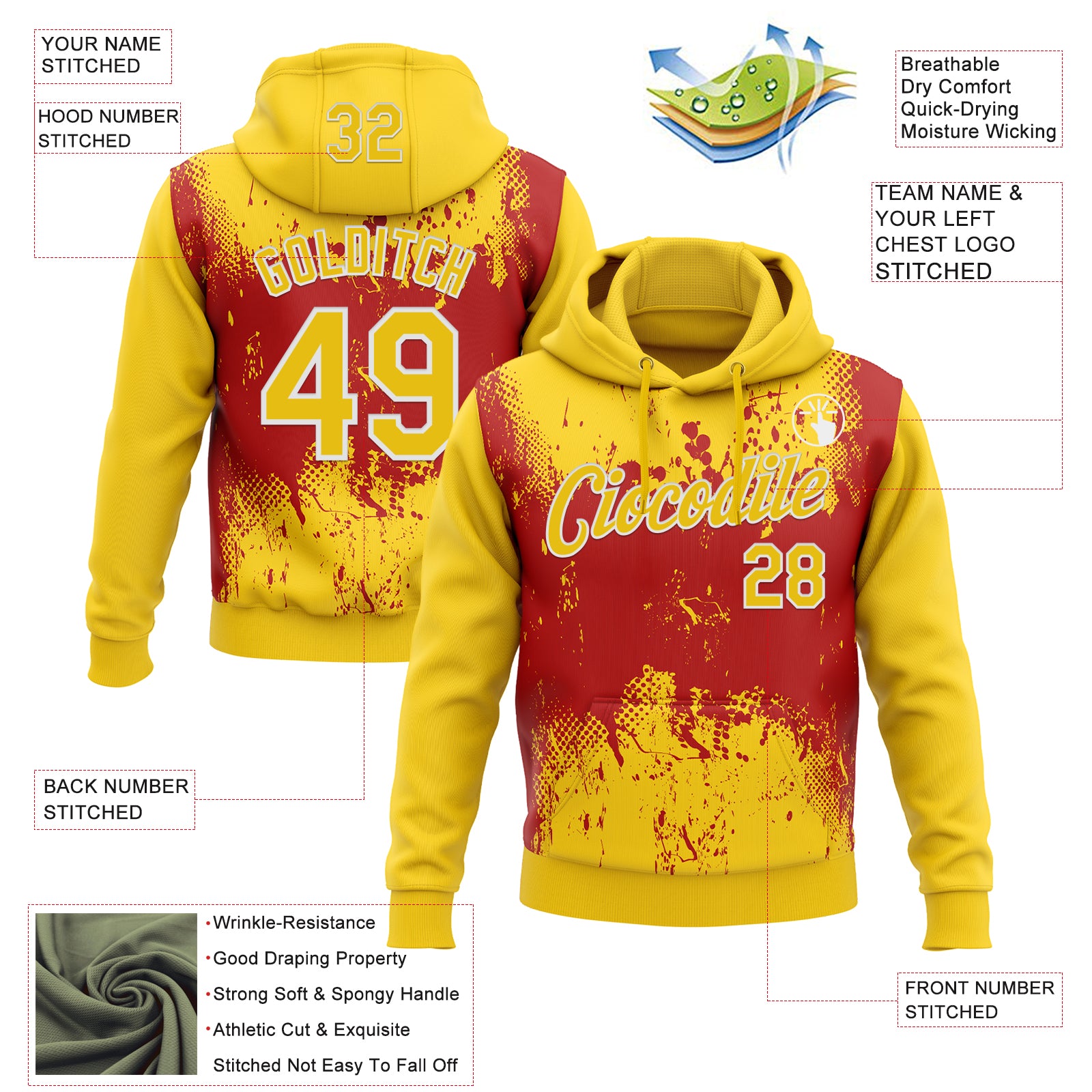 Custom Stitched Yellow Red-White 3D Pattern Design Abstract Splatter Grunge Art Sports Pullover Sweatshirt Hoodie