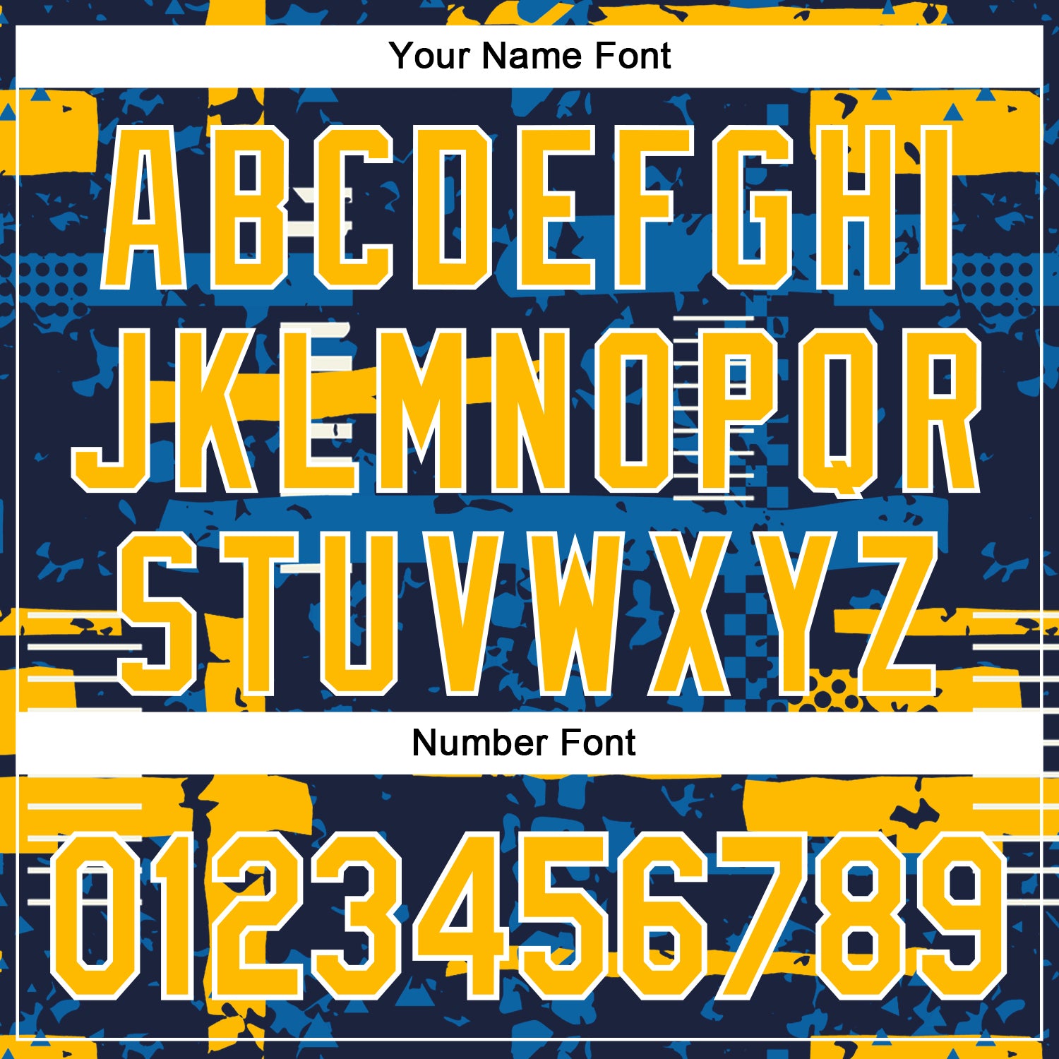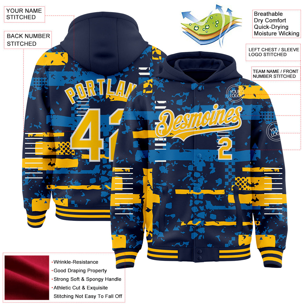 Custom Navy Gold Blue-White Abstract Fragment Shape 3D Pattern Design Bomber Full-Snap Varsity Letterman Hoodie Jacket