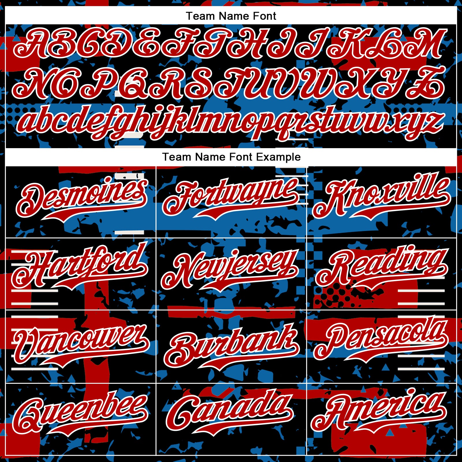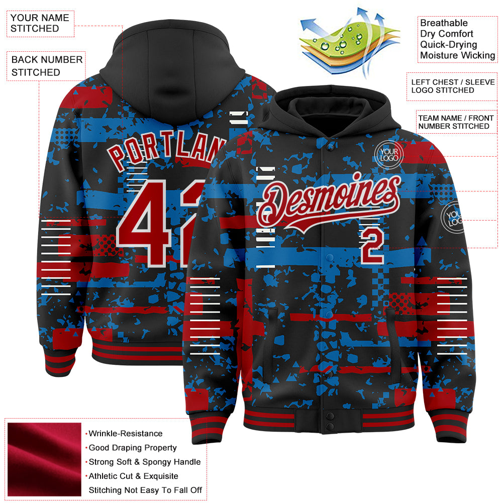 Custom Black Red Blue-White Abstract Fragment Shape 3D Pattern Design Bomber Full-Snap Varsity Letterman Hoodie Jacket