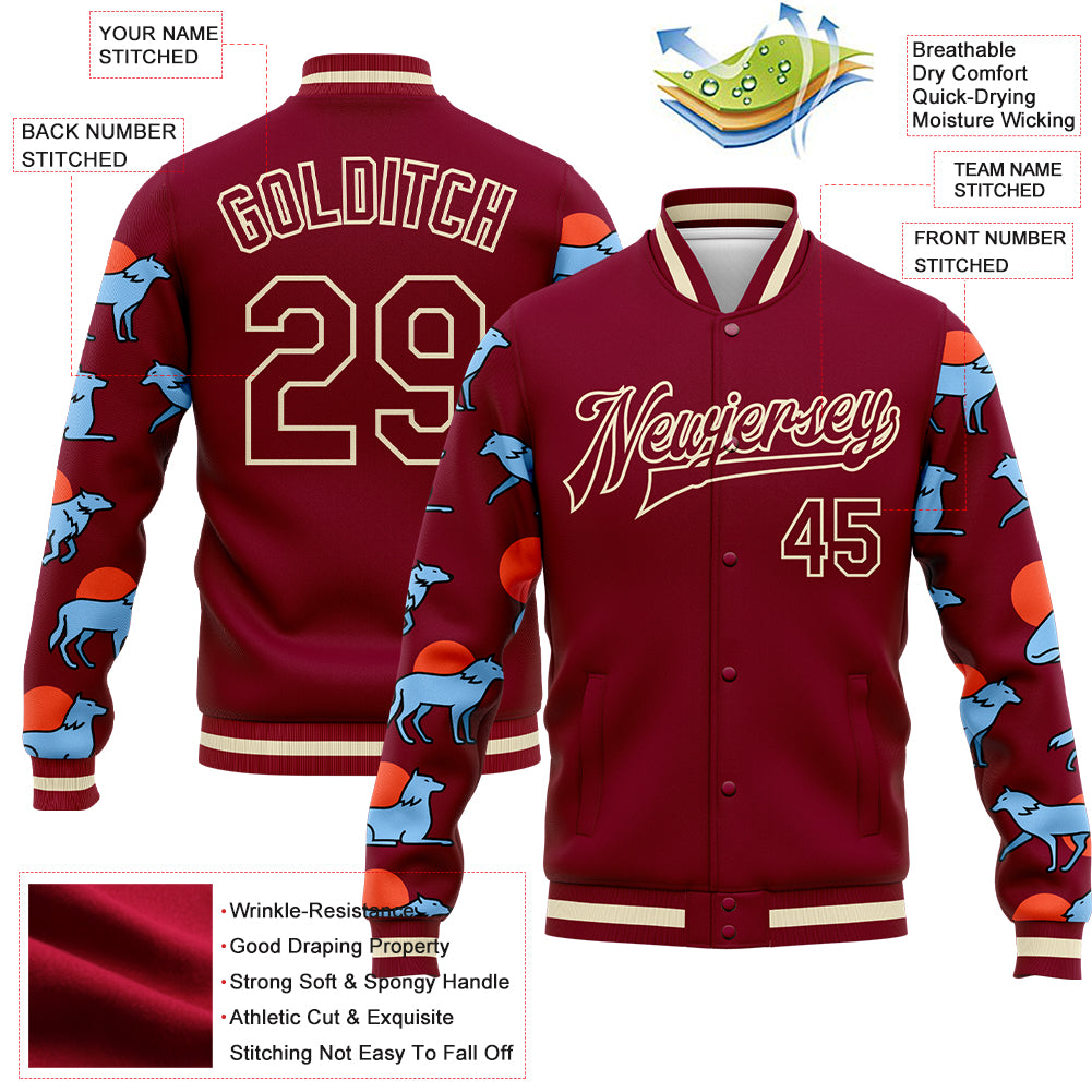 Custom Maroon Cream Wolves Hauling Jumping And Running 3D Pattern Design Bomber Full-Snap Varsity Letterman Jacket