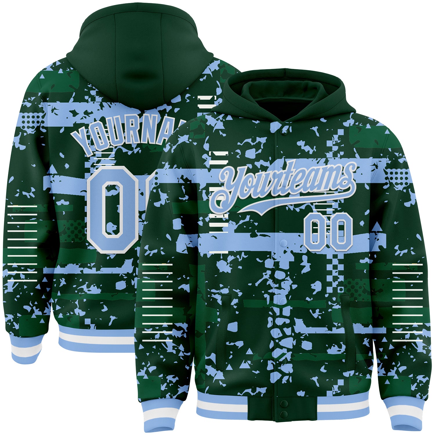 Custom Green Light Blue Kelly Green-White Abstract Fragment Shape 3D Pattern Design Bomber Full-Snap Varsity Letterman Hoodie Jacket