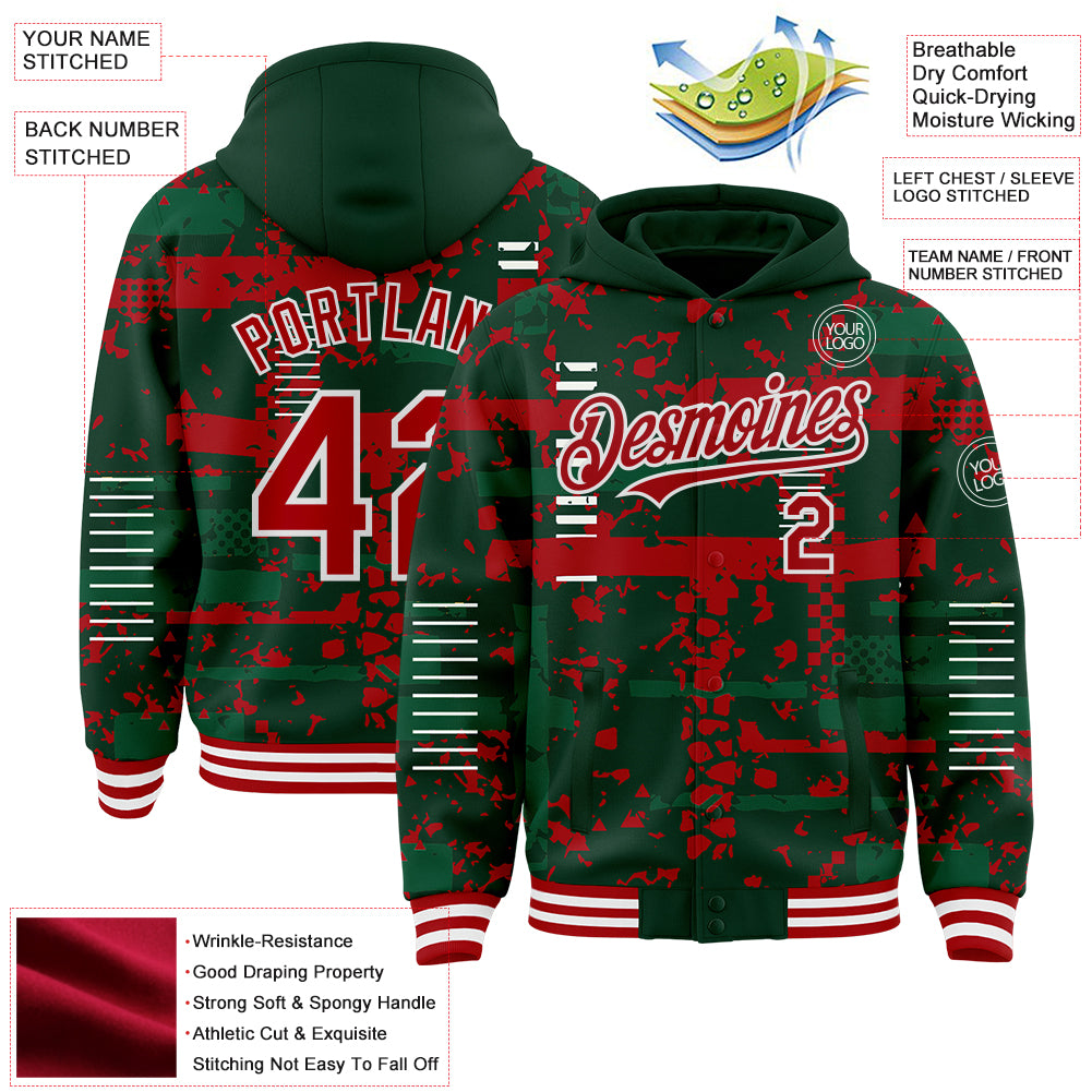 Custom Green Red Kelly Green-White Abstract Fragment Shape 3D Pattern Design Bomber Full-Snap Varsity Letterman Hoodie Jacket