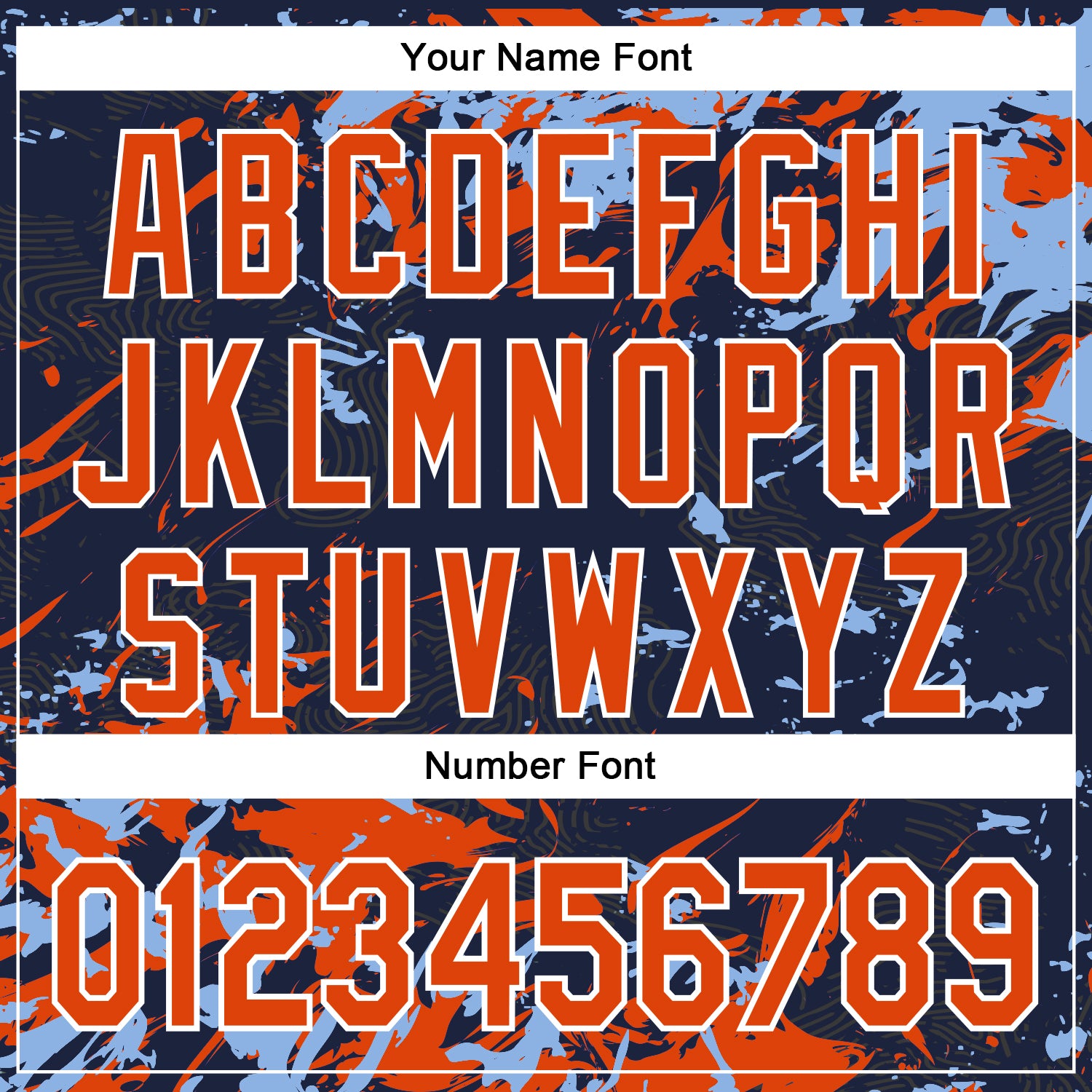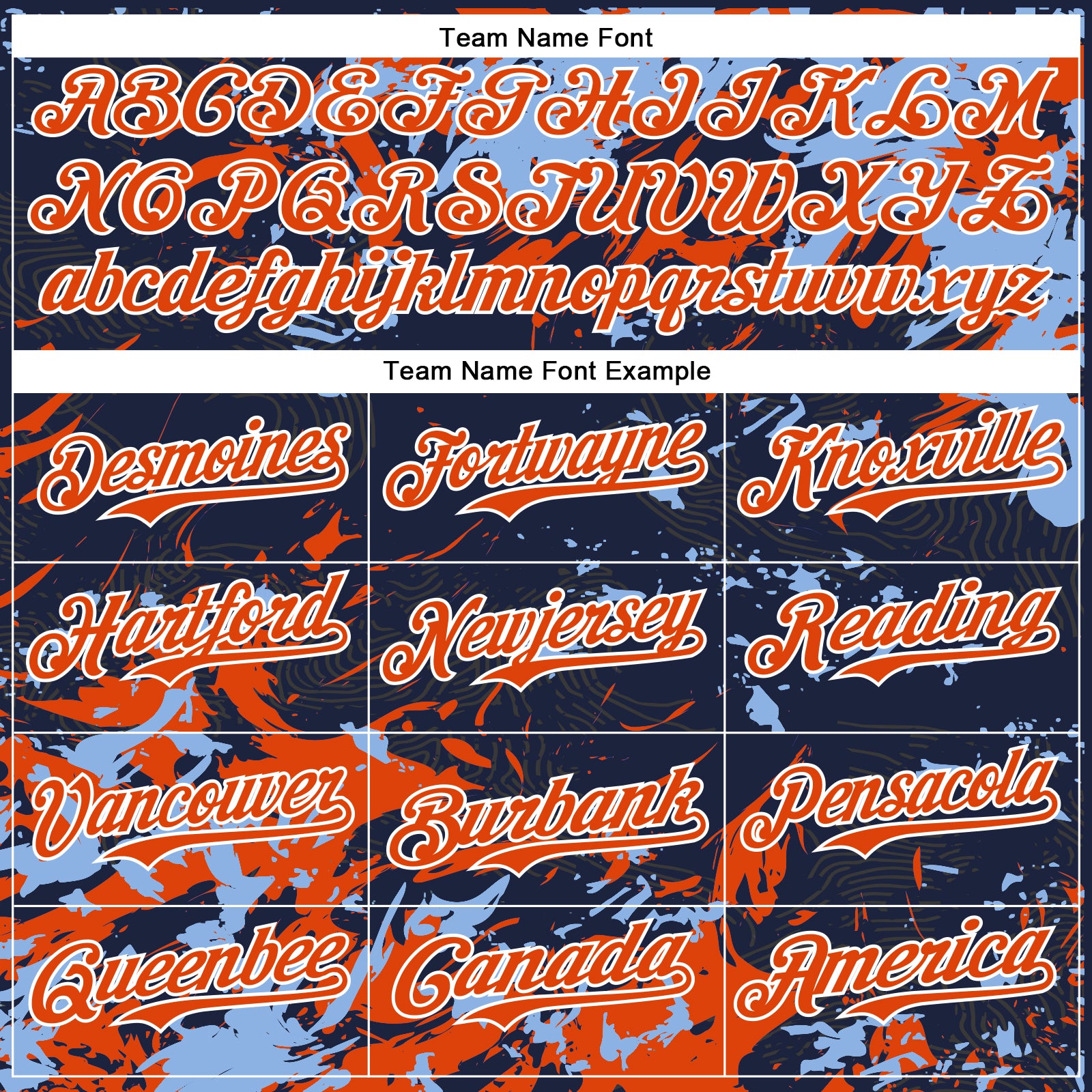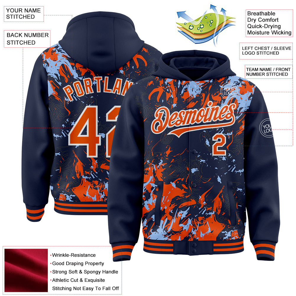 Custom Navy Orange Light Blue-White Splash 3D Pattern Design Bomber Full-Snap Varsity Letterman Hoodie Jacket