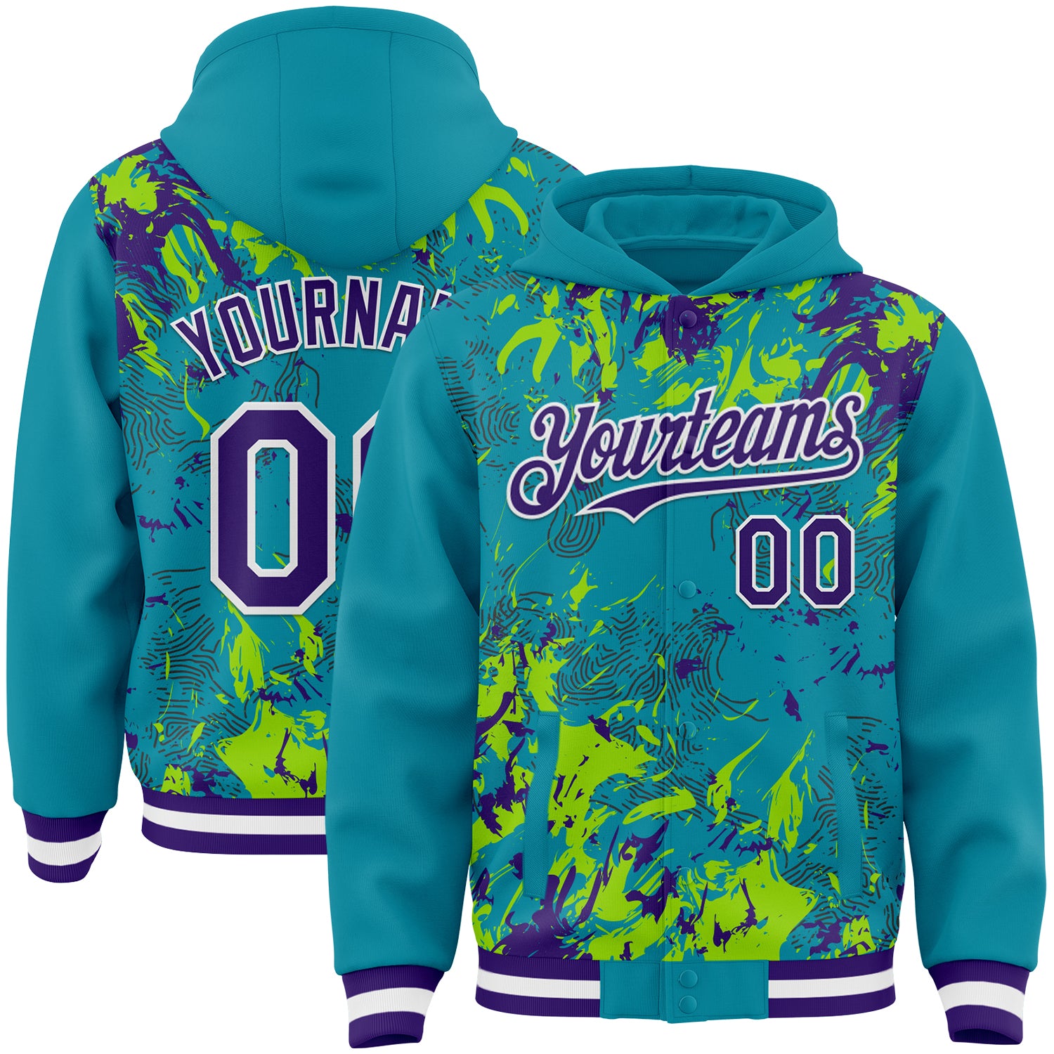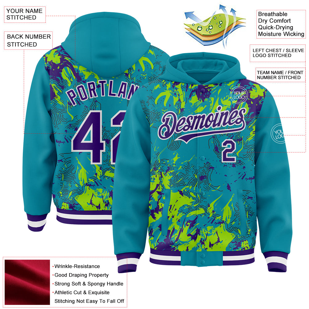 Custom Teal Purple Neon Green-White Splash 3D Pattern Design Bomber Full-Snap Varsity Letterman Hoodie Jacket