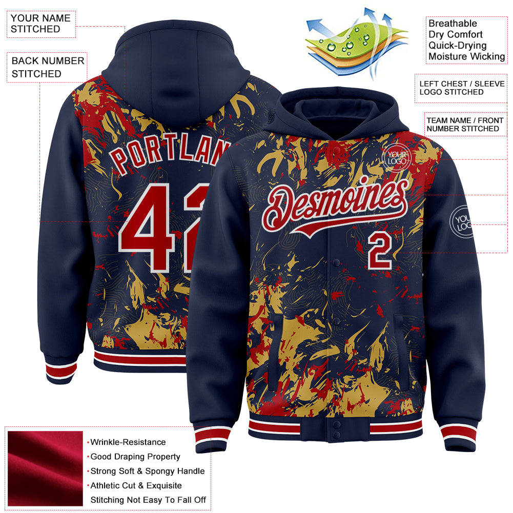 Custom Navy Red Old Gold-White Splash 3D Pattern Design Bomber Full-Snap Varsity Letterman Hoodie Jacket