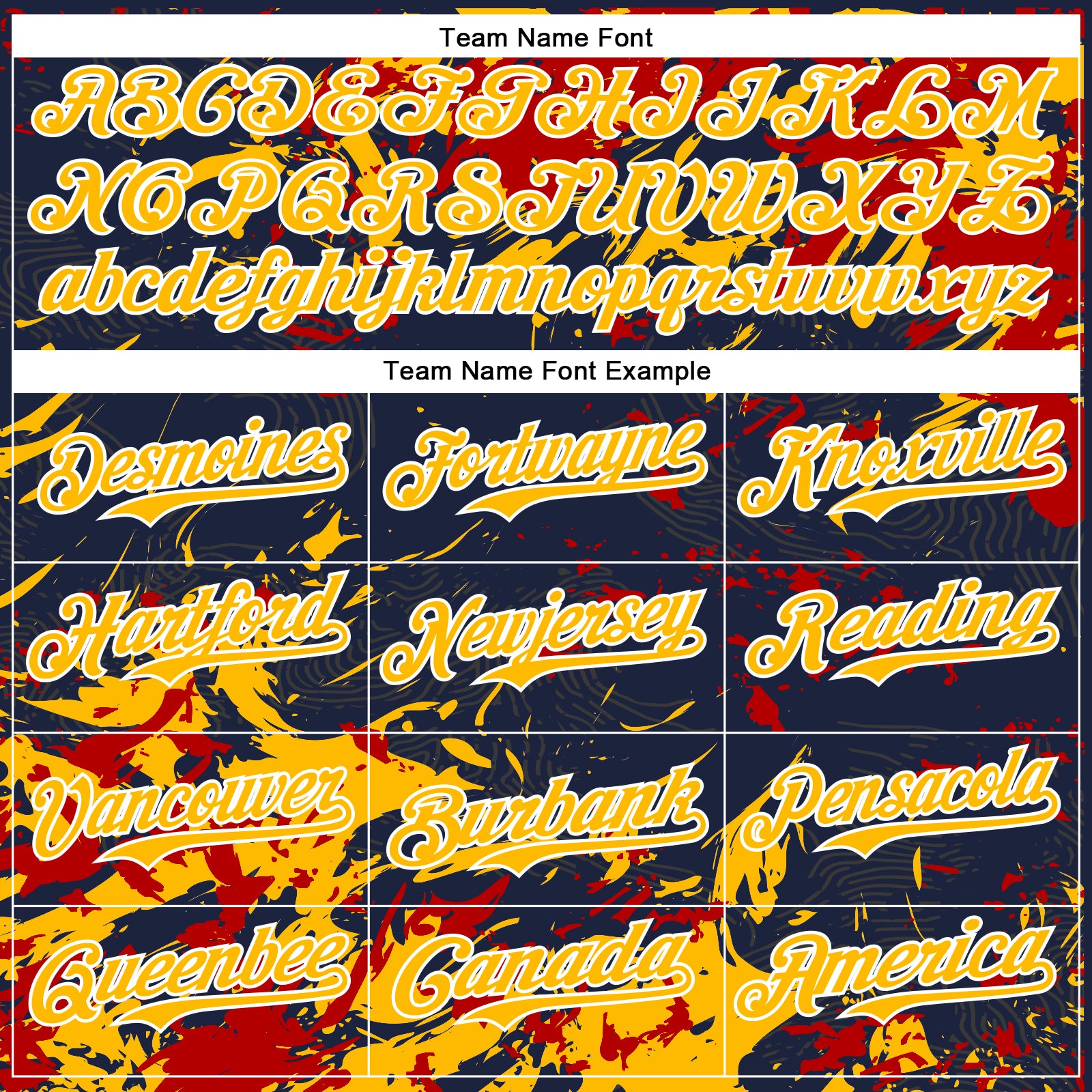 Custom Navy Gold Red-White Splash 3D Pattern Design Bomber Full-Snap Varsity Letterman Hoodie Jacket