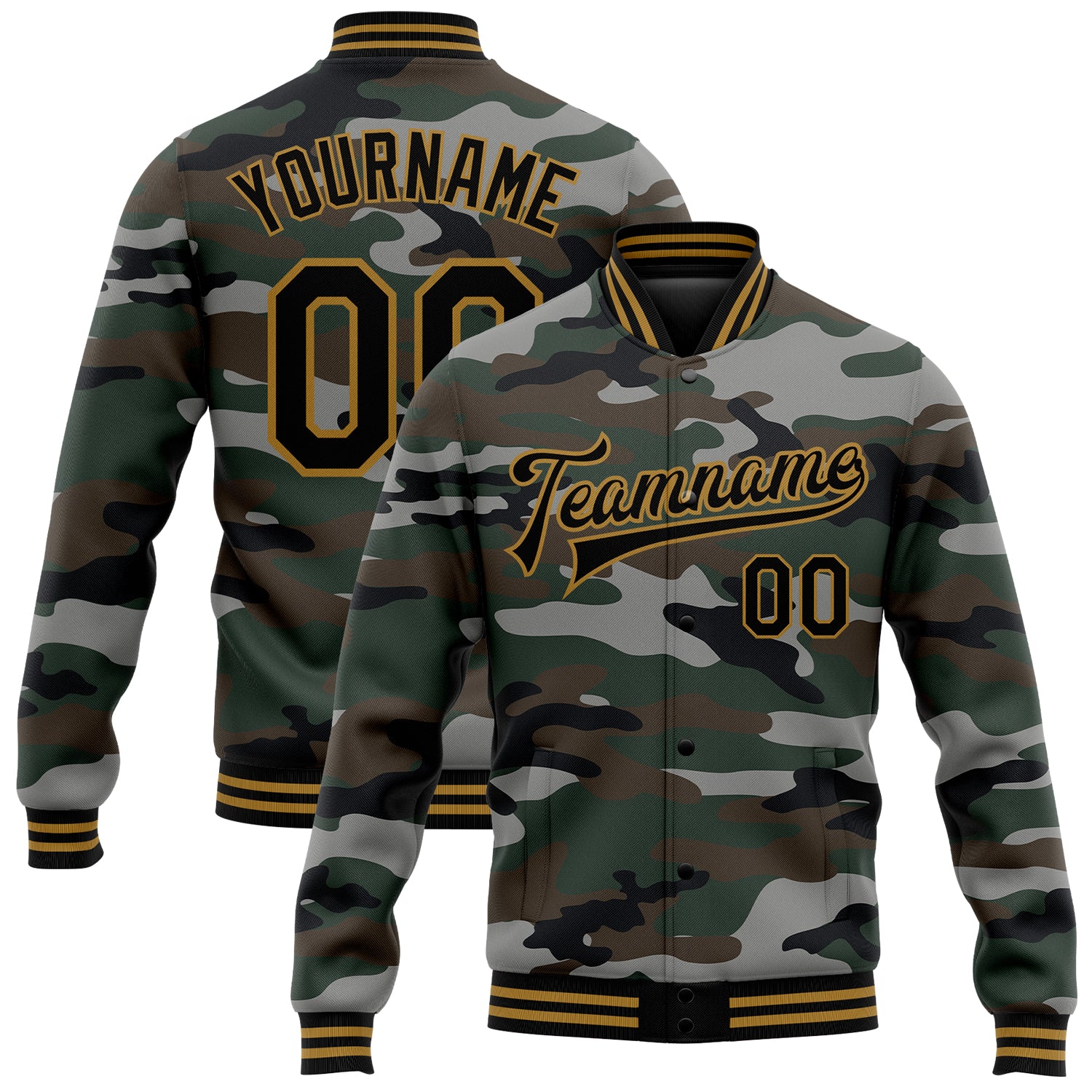 Custom Camo Black-Old Gold Jungle Camouflage 3D Bomber Full-Snap Varsity Letterman Salute To Service Jacket