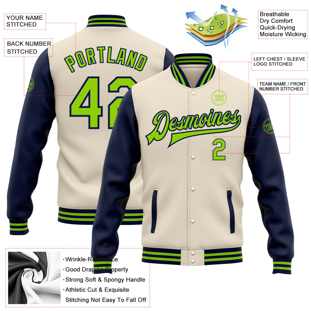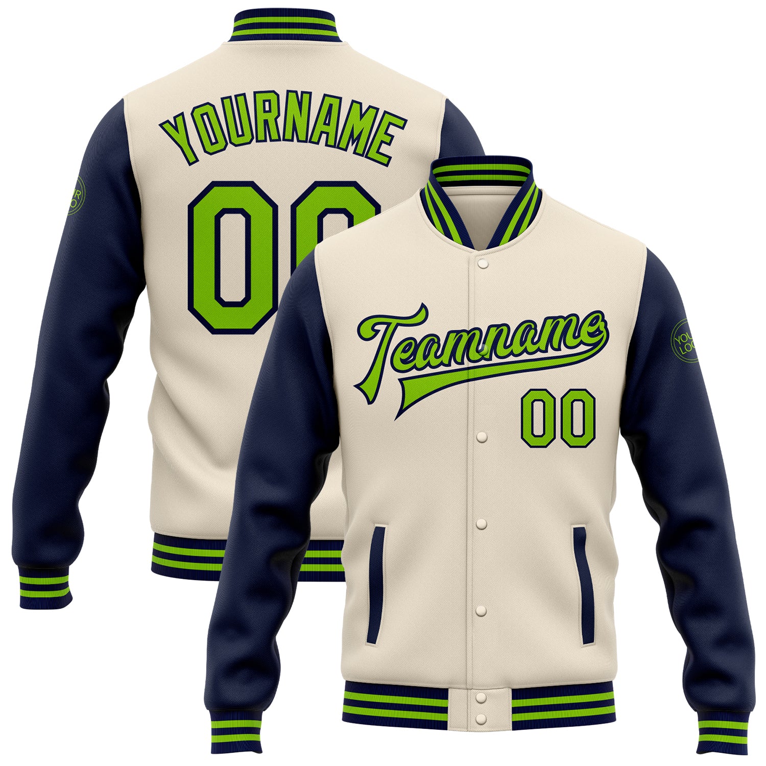 Custom Cream Neon Green-Navy Bomber Full-Snap Varsity Letterman Two Tone Jacket