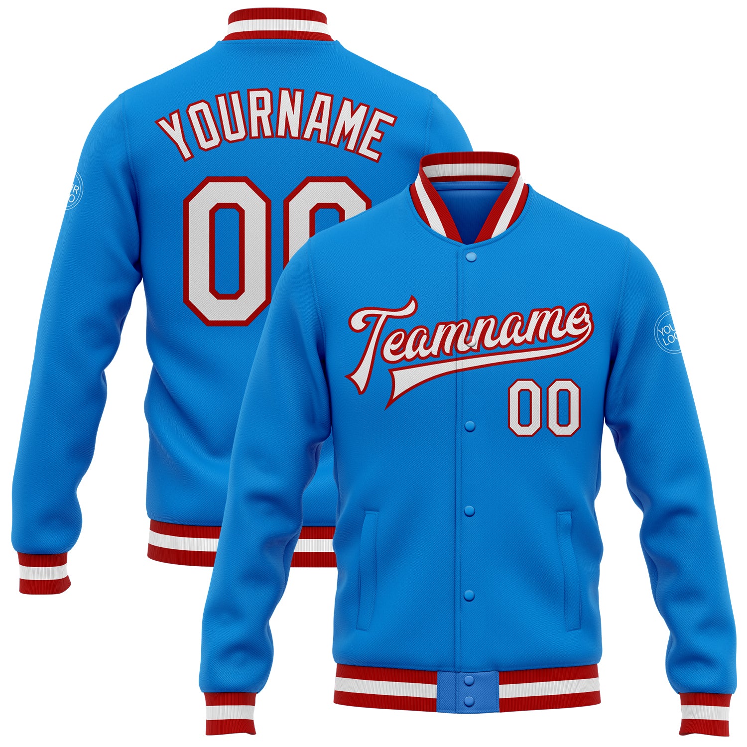 Custom Powder Blue White-Red Bomber Full-Snap Varsity Letterman Jacket
