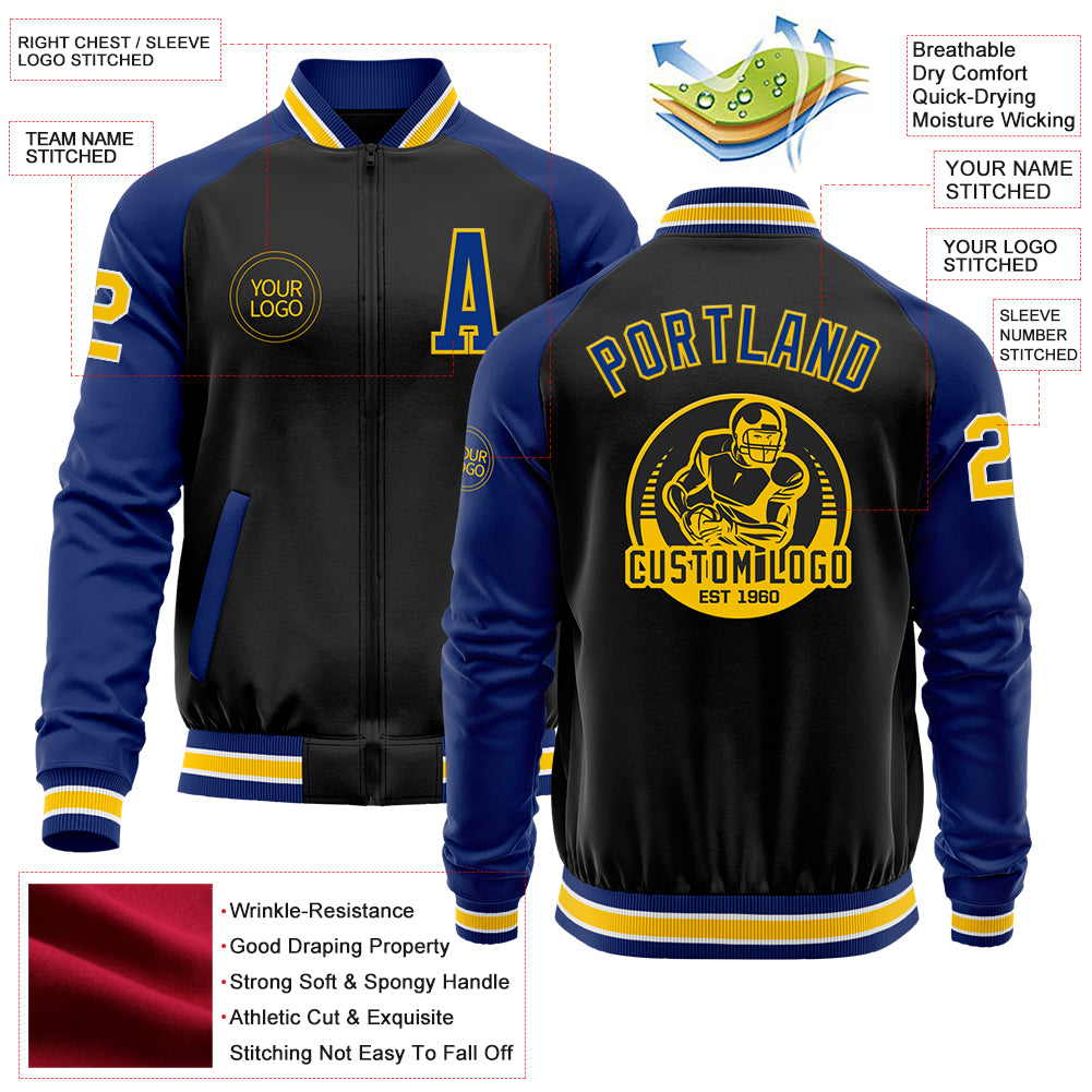 Custom Black Yellow-Royal Bomber Varsity Letterman Two Tone Zipper Jacket