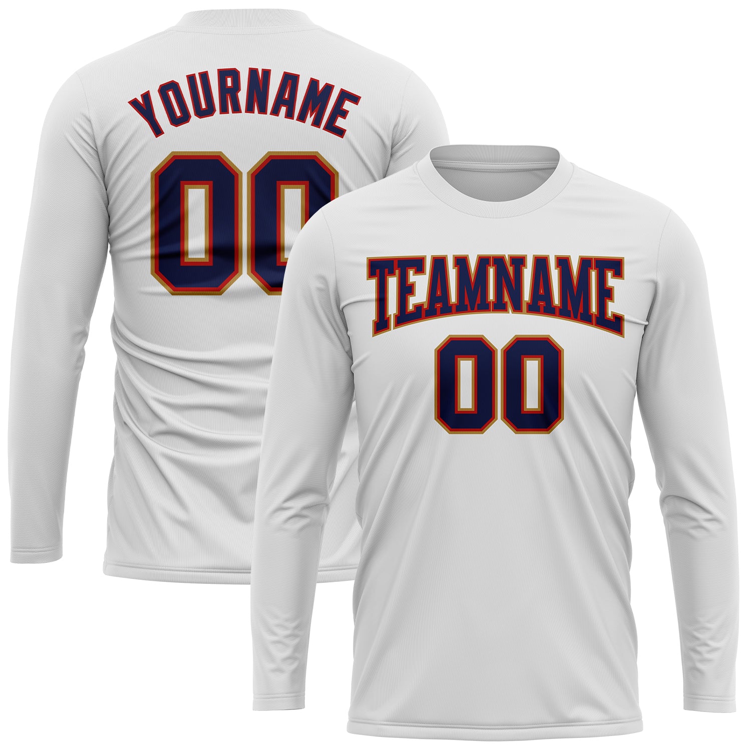Custom White Navy Red-Old Gold Long Sleeve Performance T-Shirt