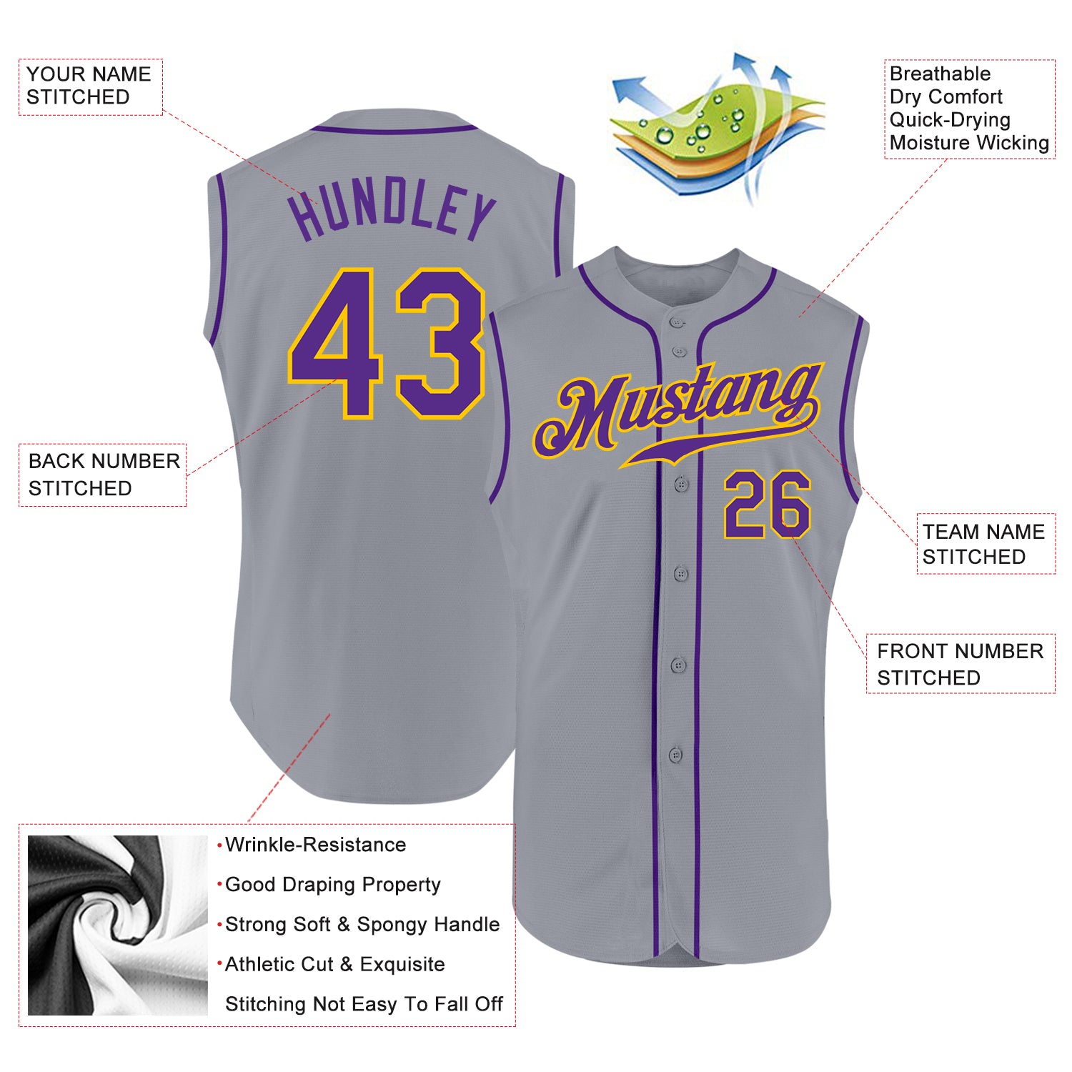 Custom Gray Purple-Gold Authentic Sleeveless Baseball Jersey