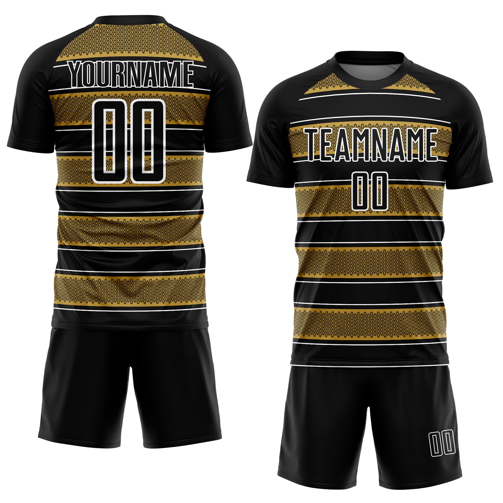 Custom Black Old Gold-White Geometric Shapes And Line Sublimation Soccer Uniform Jersey