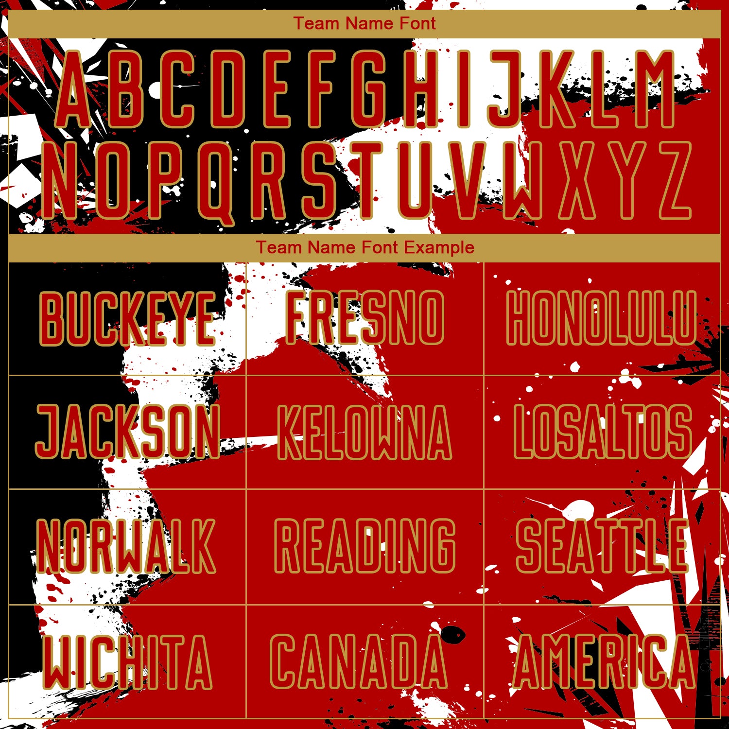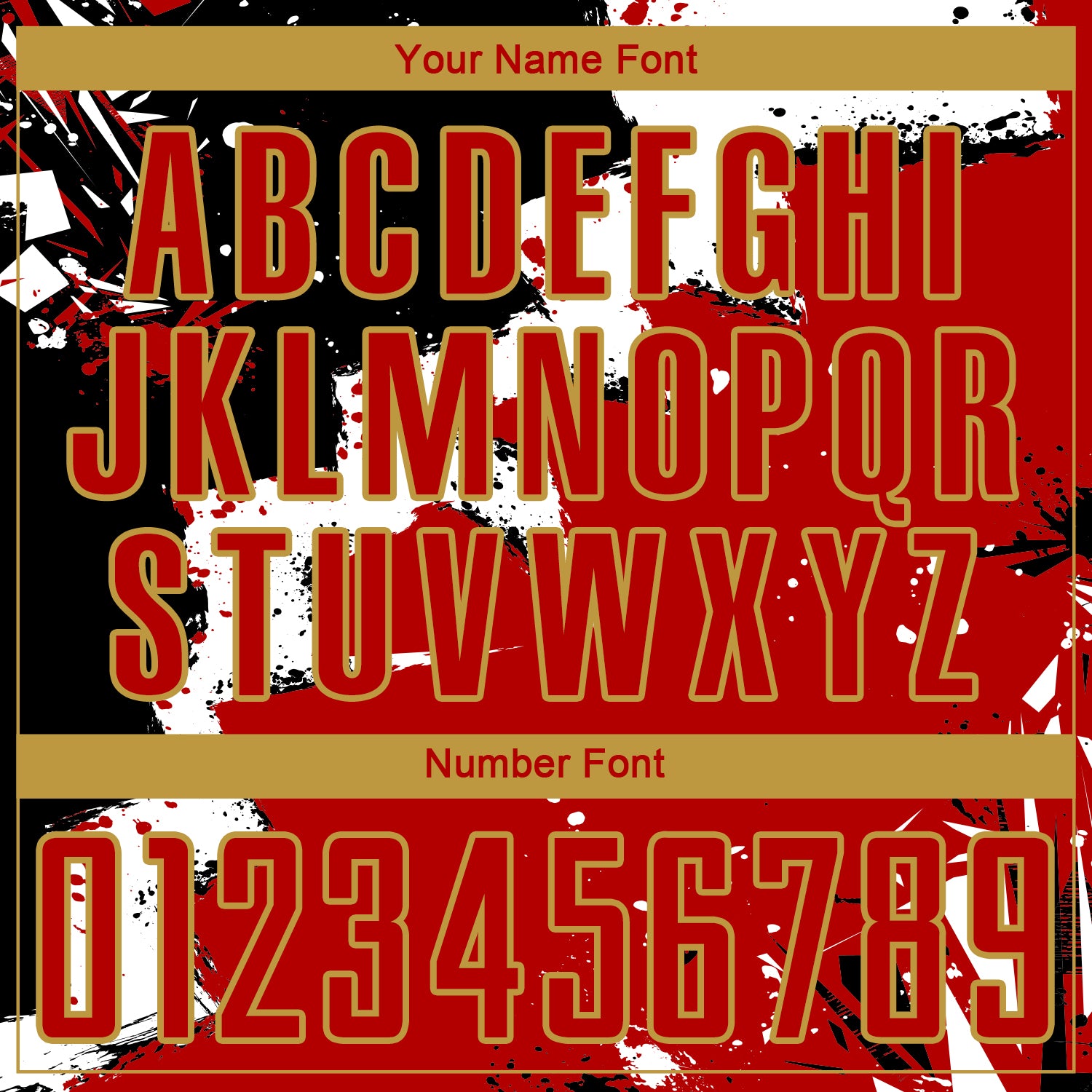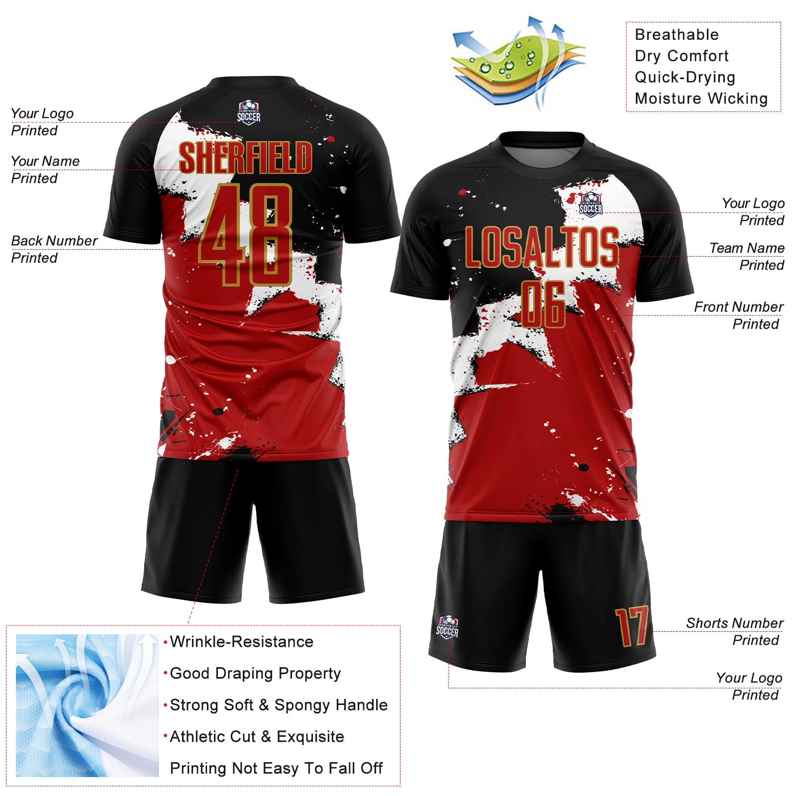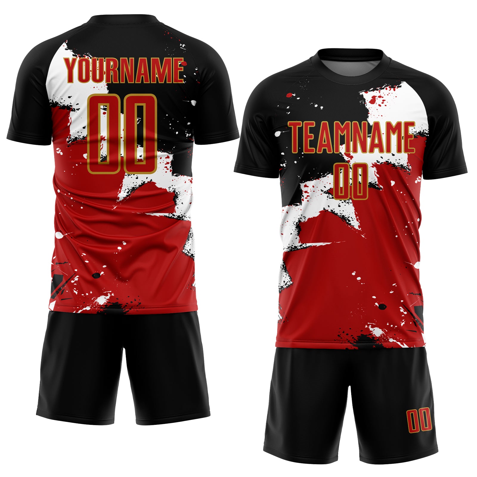 Custom Black Red-Old Gold Spalsh Sublimation Soccer Uniform Jersey