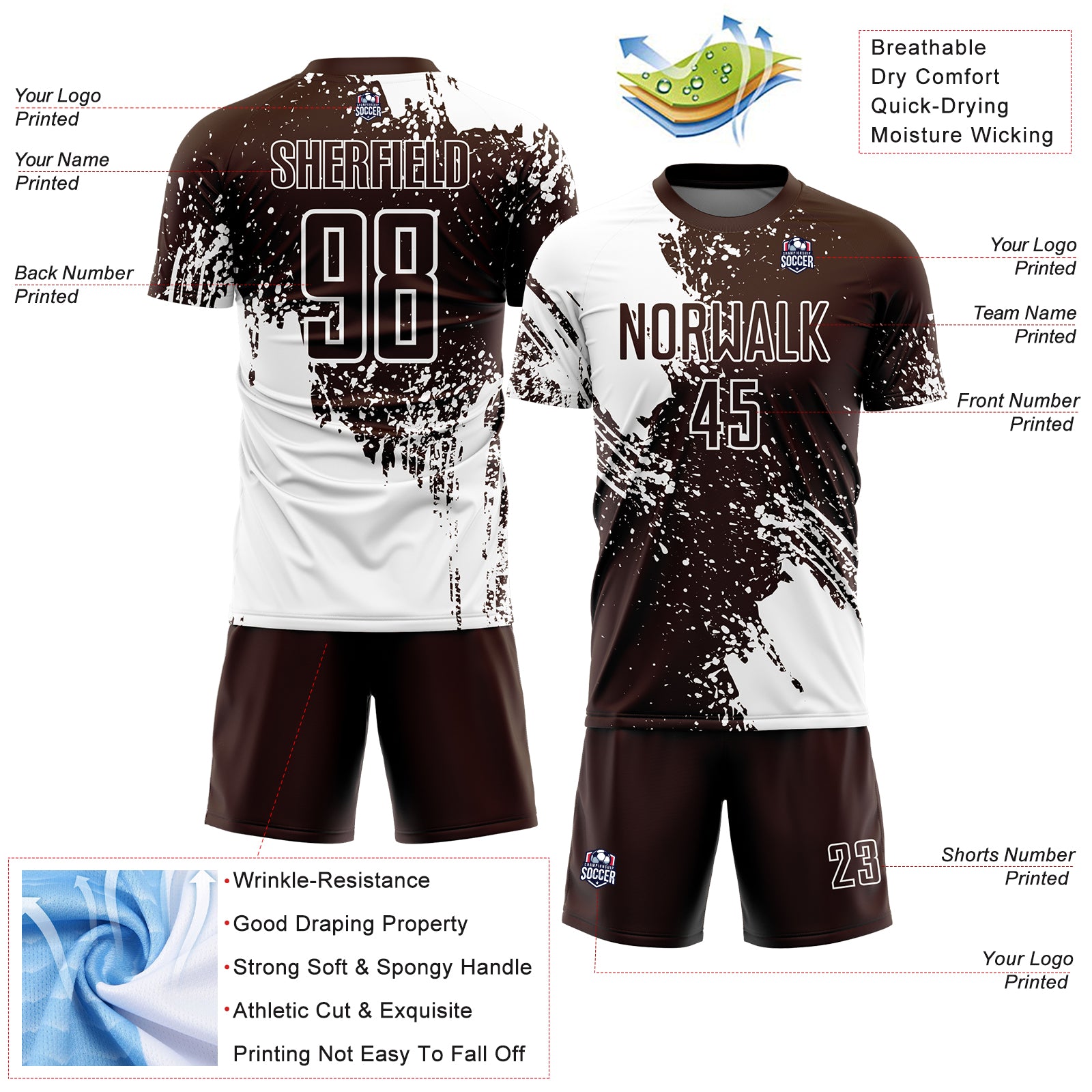 Custom Brown White Abstract Brush Stroke Sports Sublimation Soccer Uniform Jersey