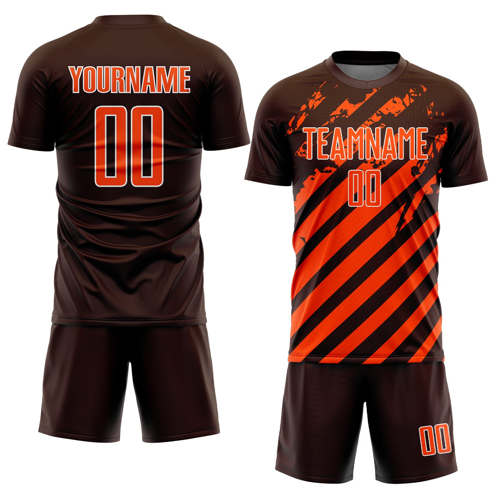 Custom Brown Orange-White Distressed Diagonal Stripe Pattern Sports Sublimation Soccer Uniform Jersey