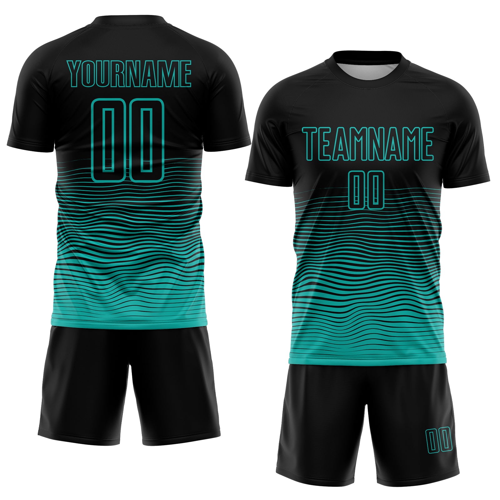 Custom Black Aqua Gradient Wave Line Sports Sublimation Soccer Uniform Jersey