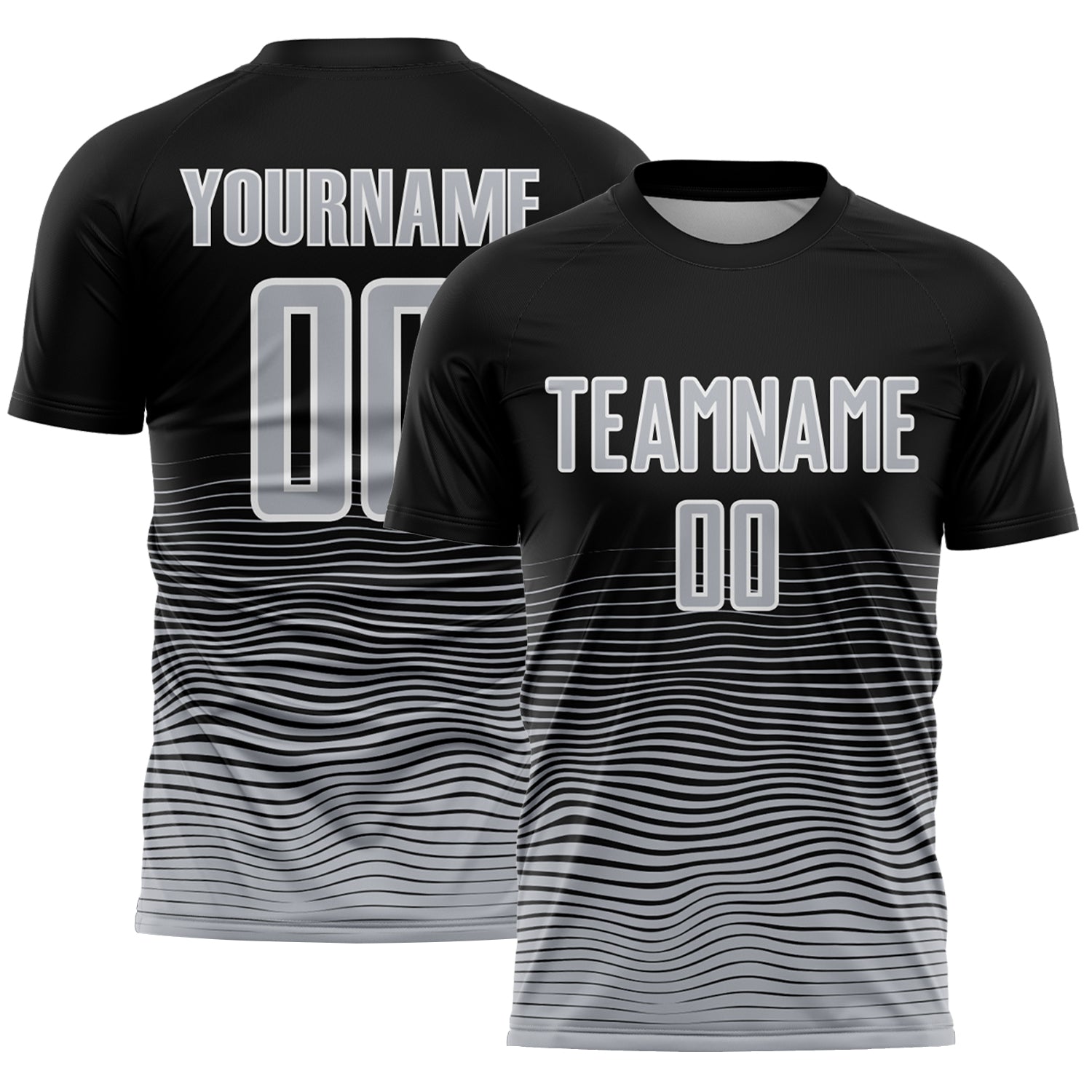 Custom Black Gray-White Gradient Wave Line Sports Sublimation Soccer Uniform Jersey