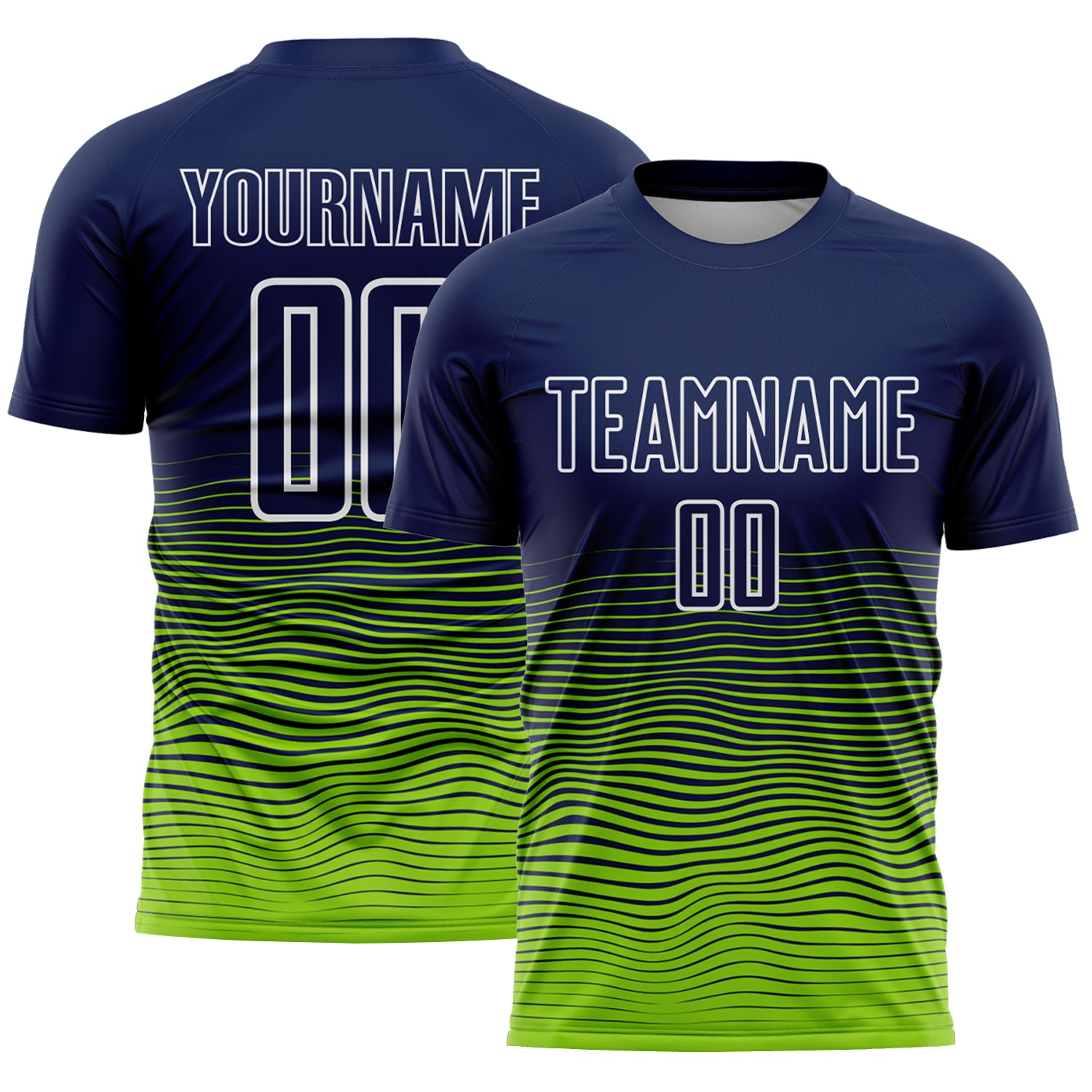 Custom Navy White-Neon Green Gradient Wave Line Sports Sublimation Soccer Uniform Jersey