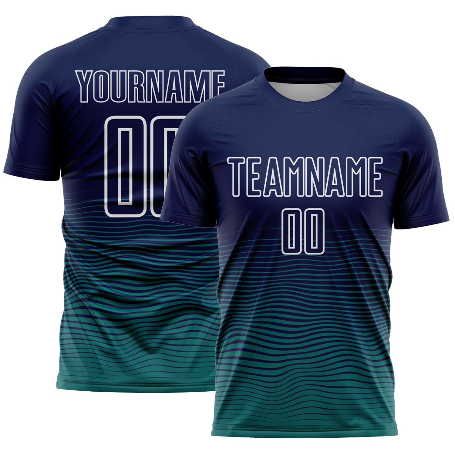 Custom Navy White-Teal Gradient Wave Line Sports Sublimation Soccer Uniform Jersey