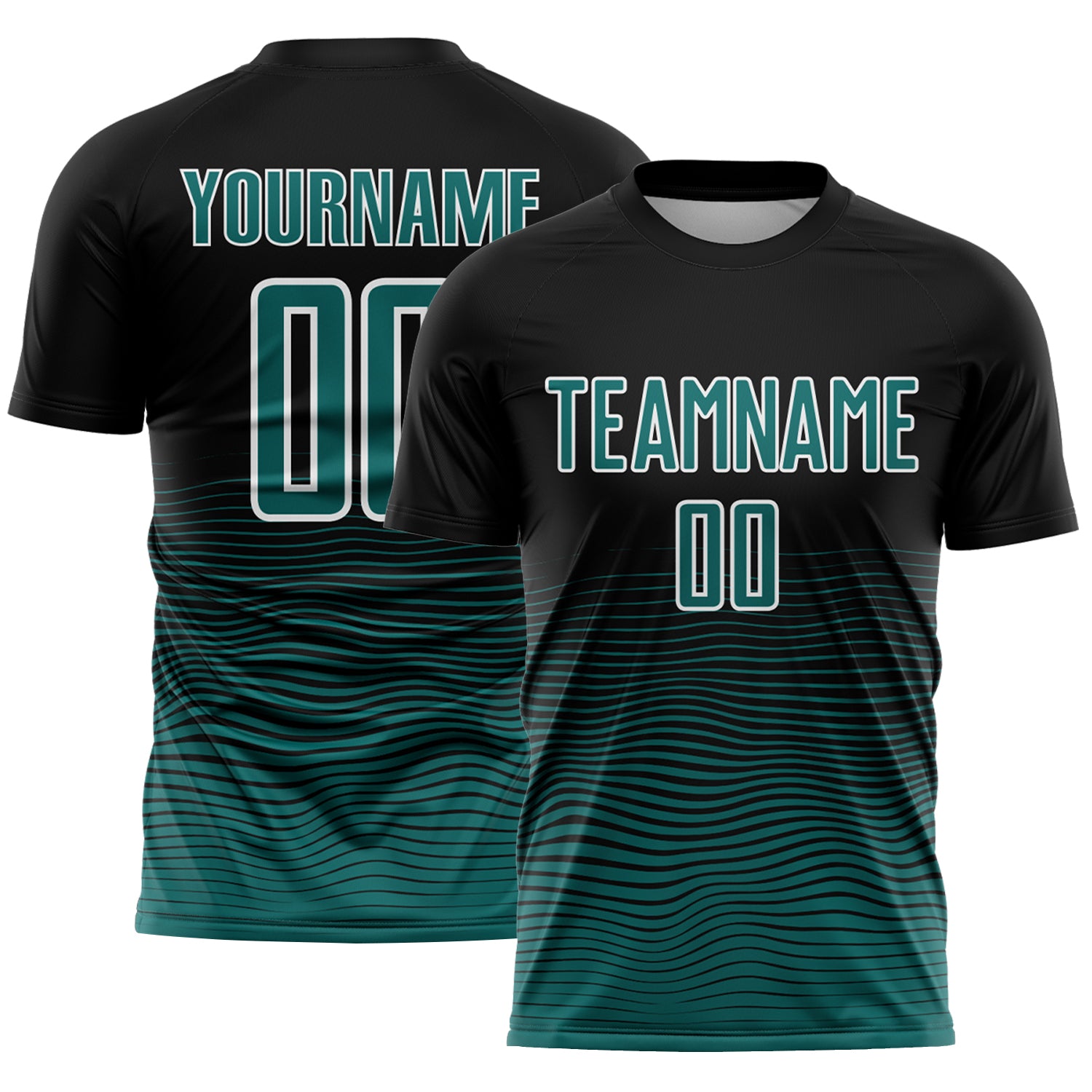 Custom Black Teal-White Gradient Wave Line Sports Sublimation Soccer Uniform Jersey