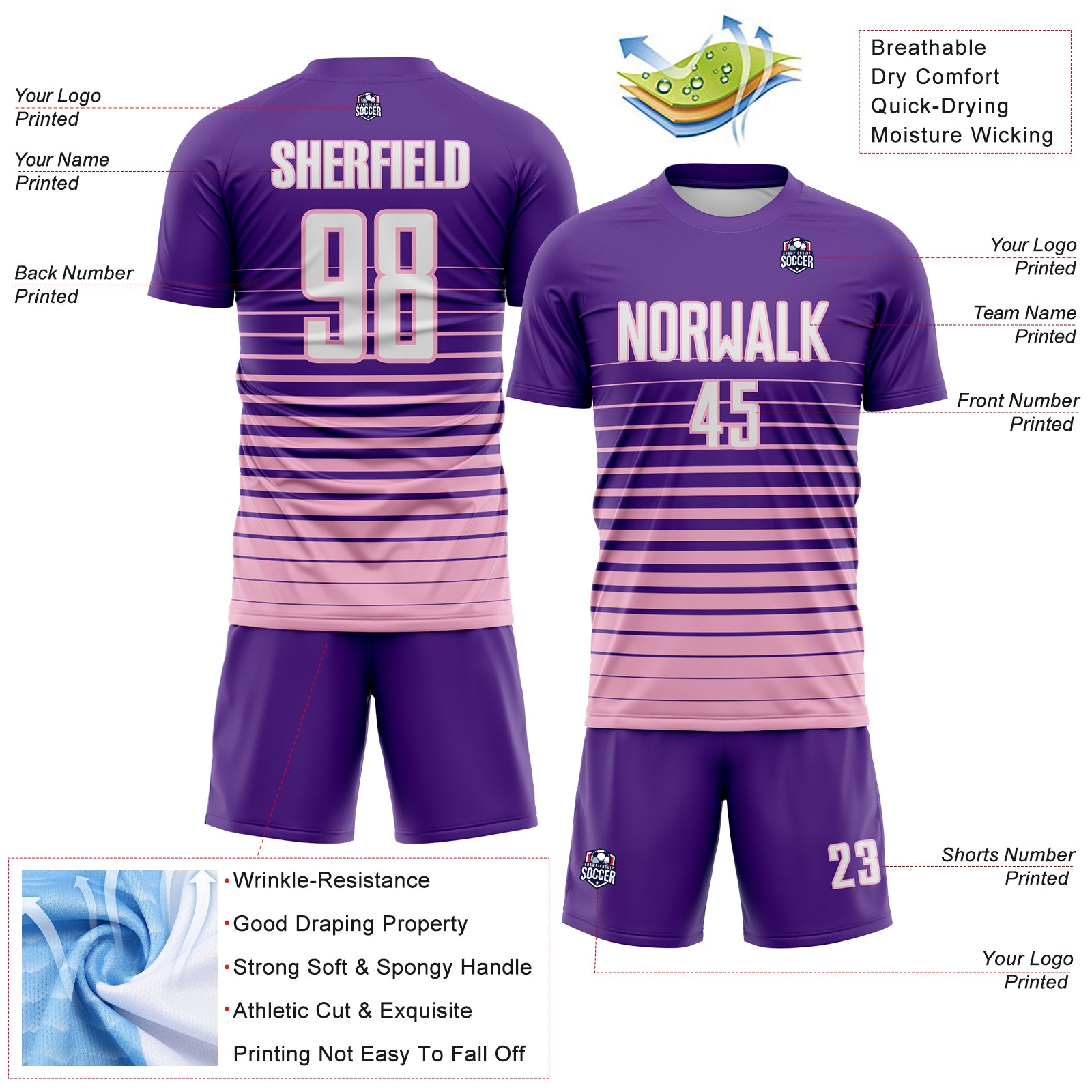 Custom Purple White-Light Pink Gradient Pinstripe Sublimation Soccer Uniform Jersey