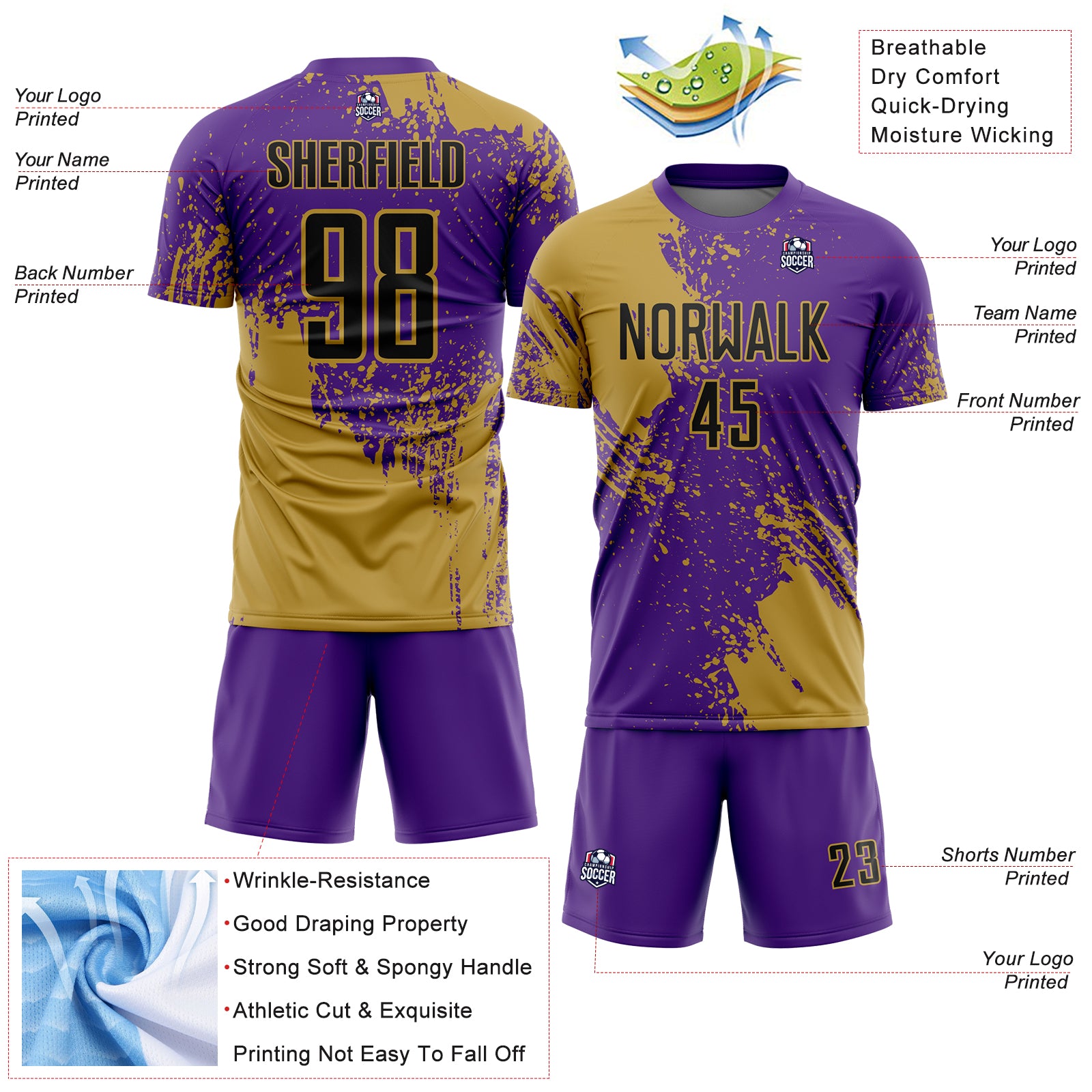 Custom Purple Black-Old Gold Abstract Brush Stroke Sports Sublimation Soccer Uniform Jersey