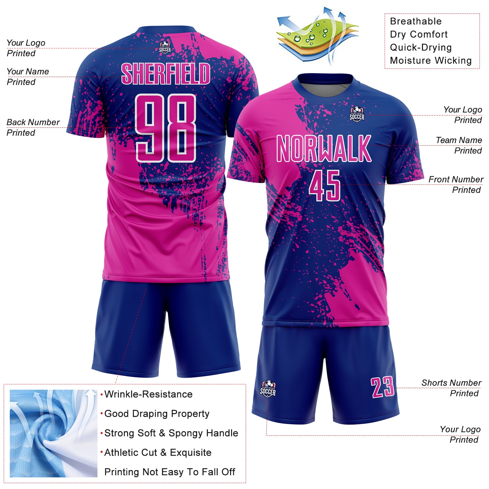 Custom Royal Deep Pink-White Abstract Brush Stroke Sports Sublimation Soccer Uniform Jersey