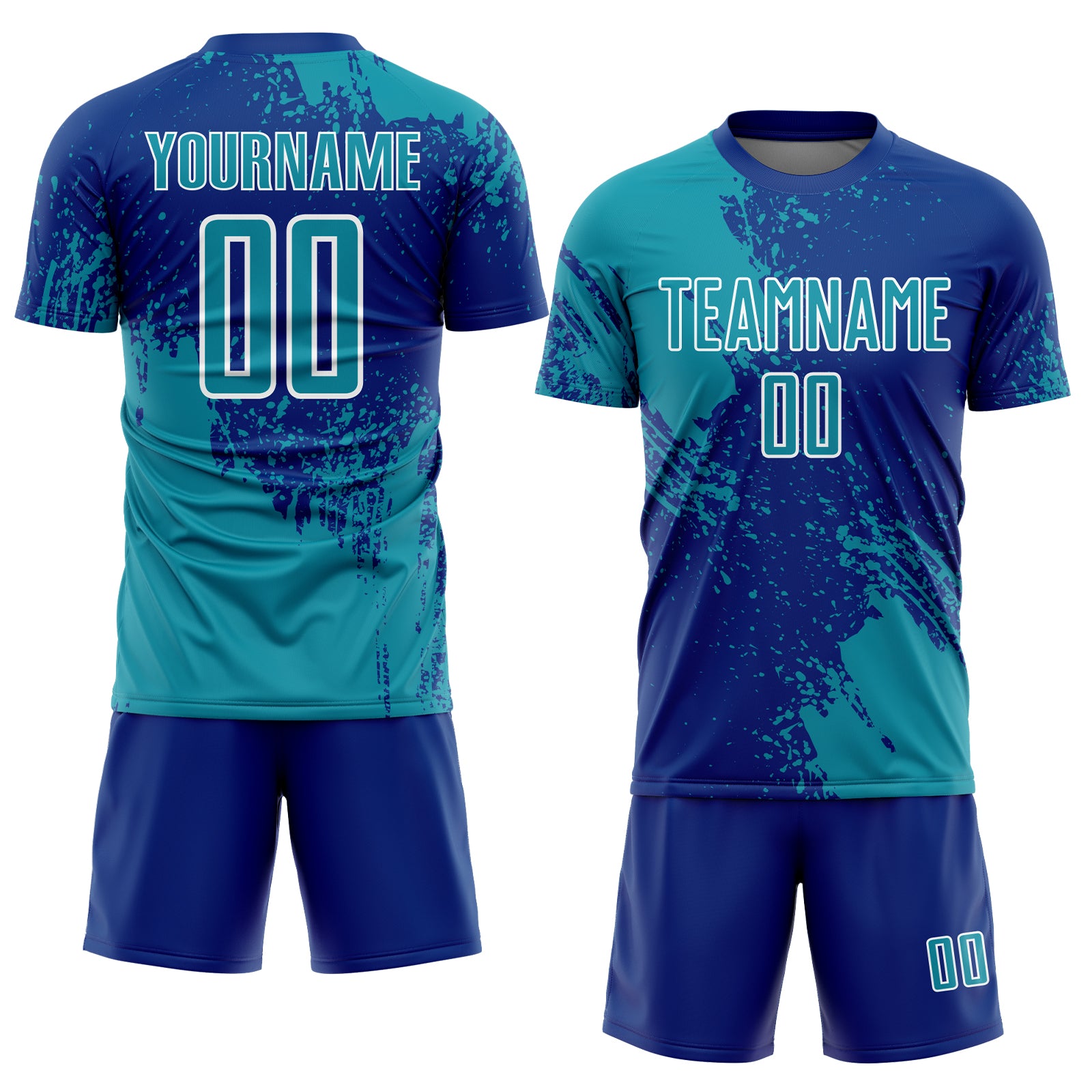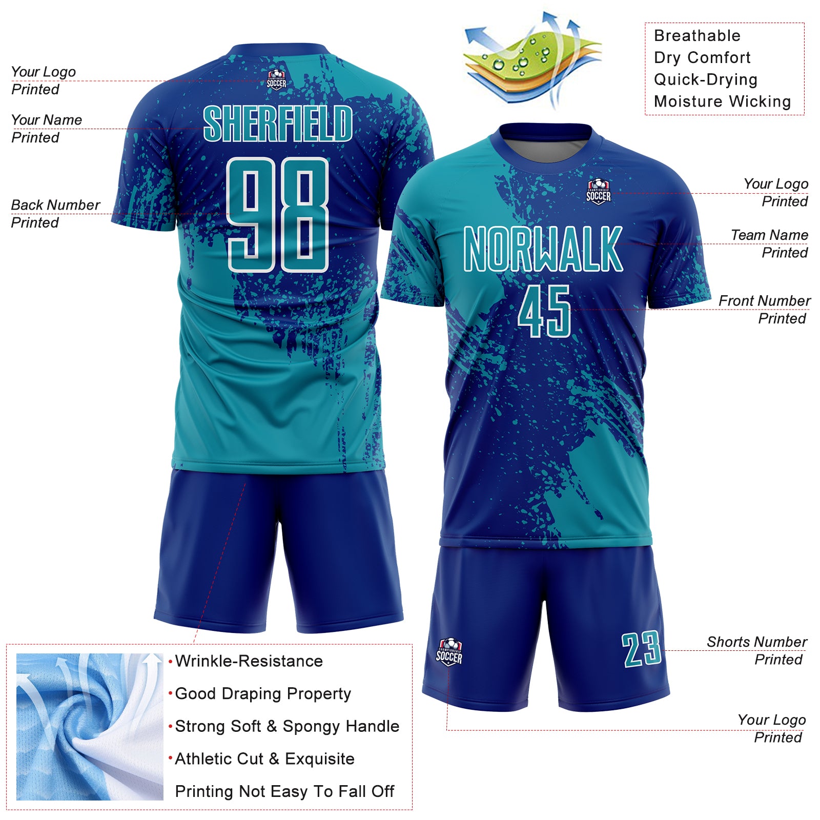 Custom Royal Teal-White Abstract Brush Stroke Sports Sublimation Soccer Uniform Jersey