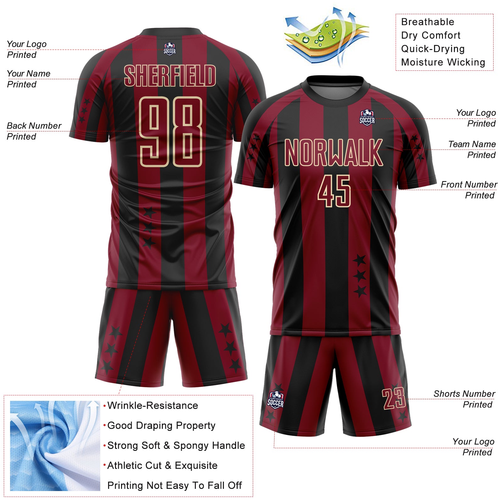 Custom Black Crimson-Cream Stars And Stripes Sports Sublimation Soccer Uniform Jersey