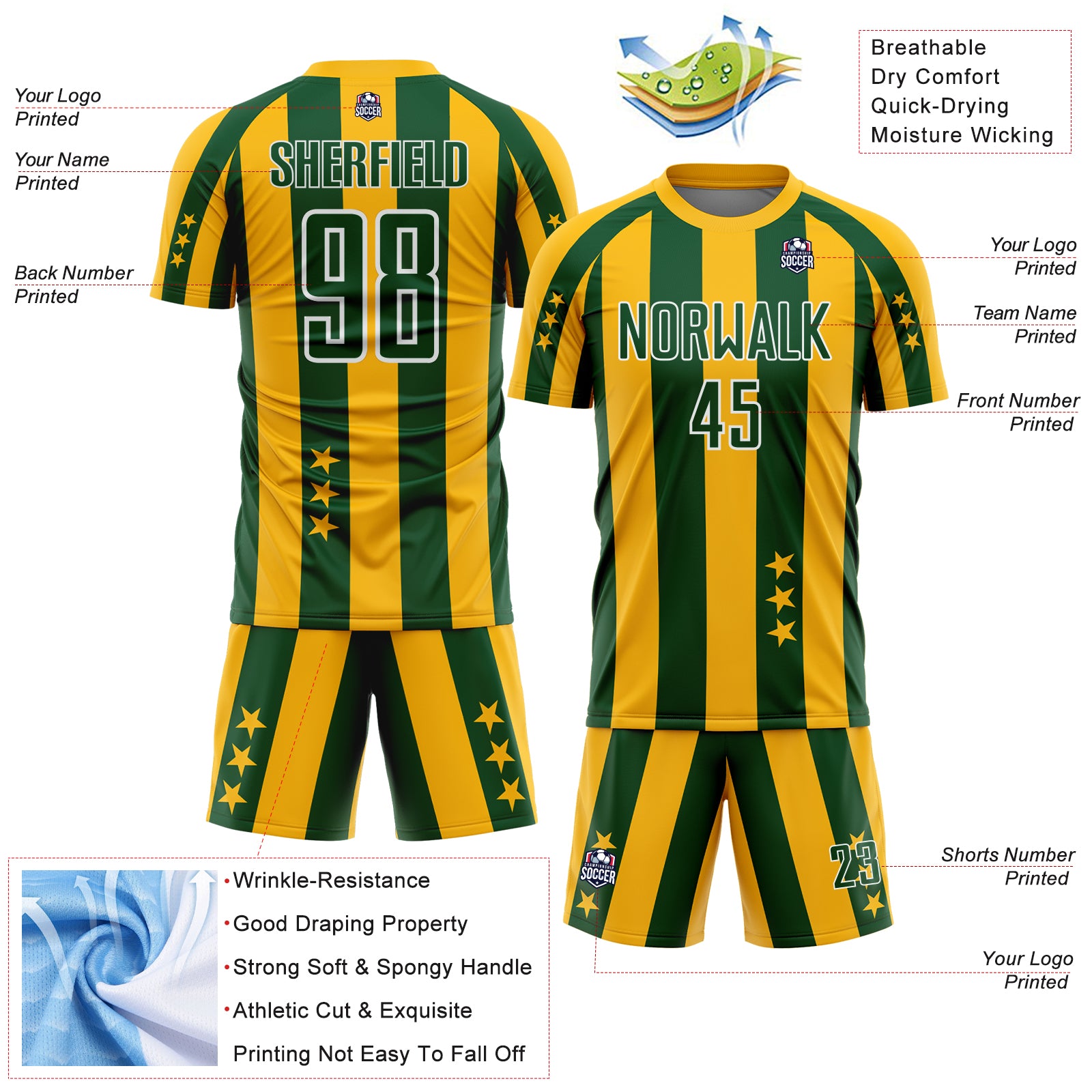 Custom Gold Green-White Stars And Stripes Sports Sublimation Soccer Uniform Jersey