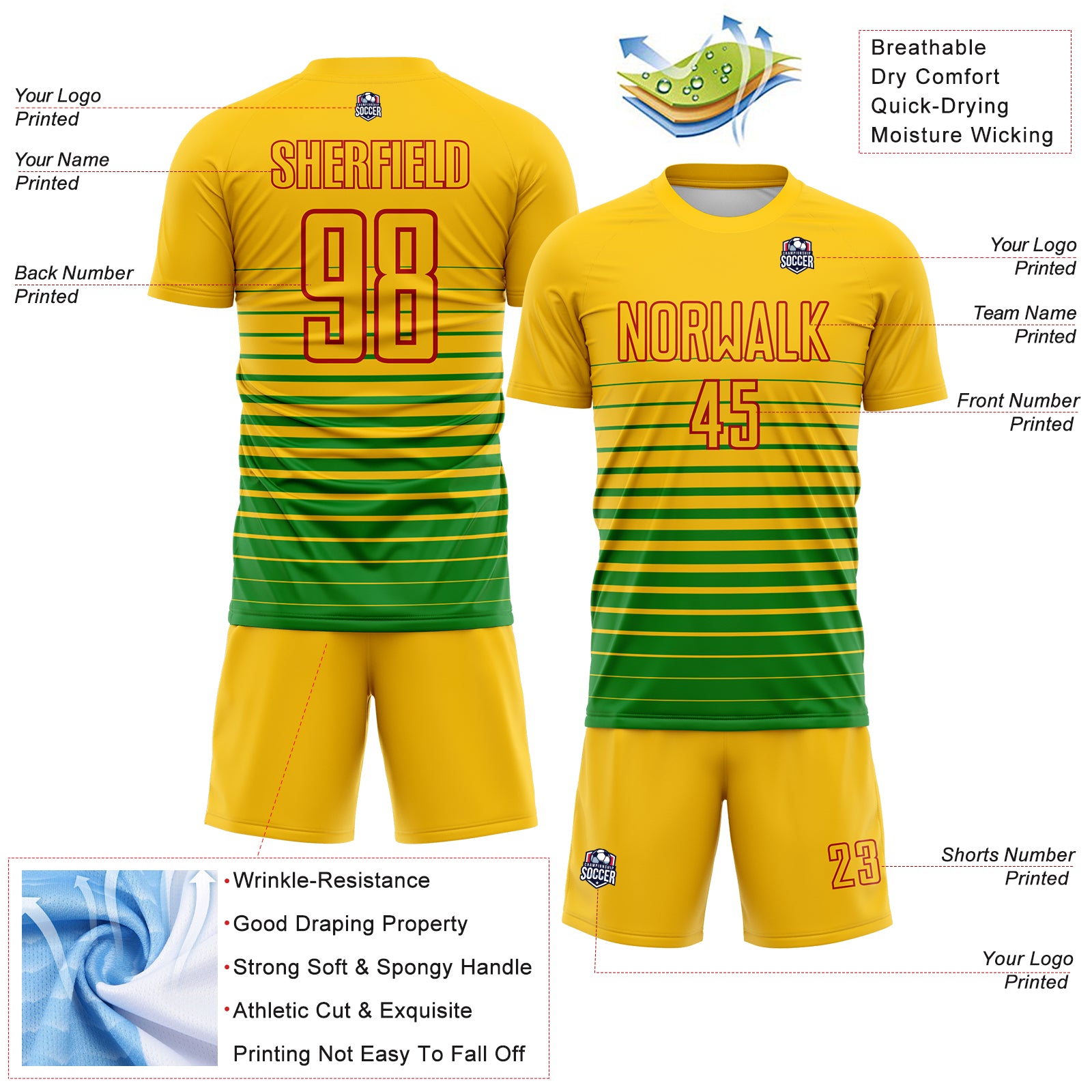 Custom Yellow Red-Grass Green Gradient Pinstripe Sublimation Soccer Uniform Jersey