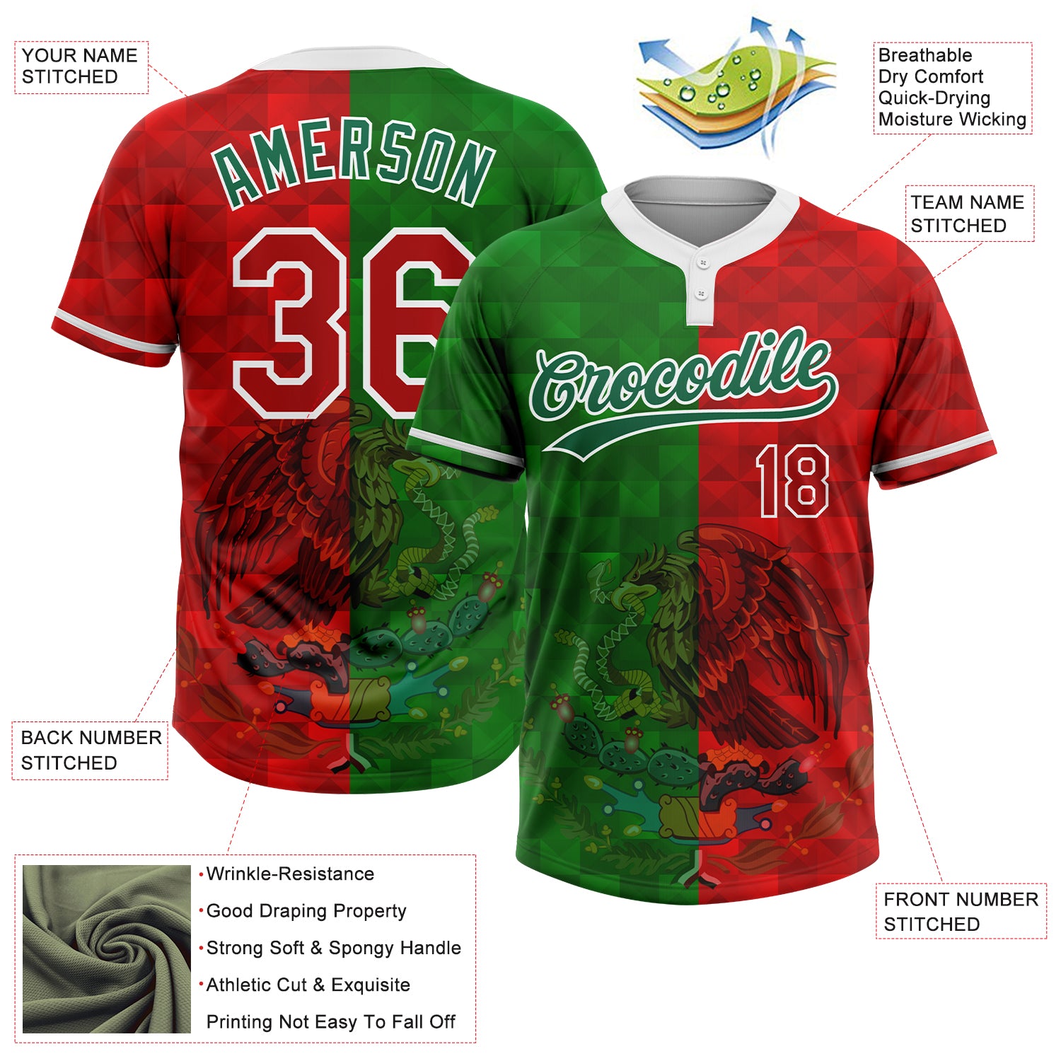 Custom Red Kelly Green-White Mexico Two-Button Unisex Softball Jersey