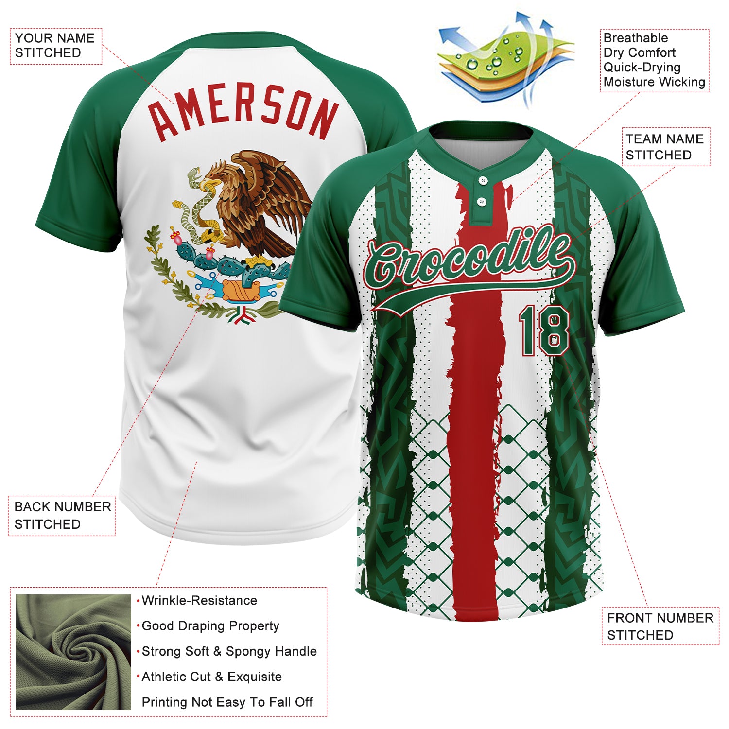 Custom Kelly Green Red-White Mexico Two-Button Unisex Softball Jersey
