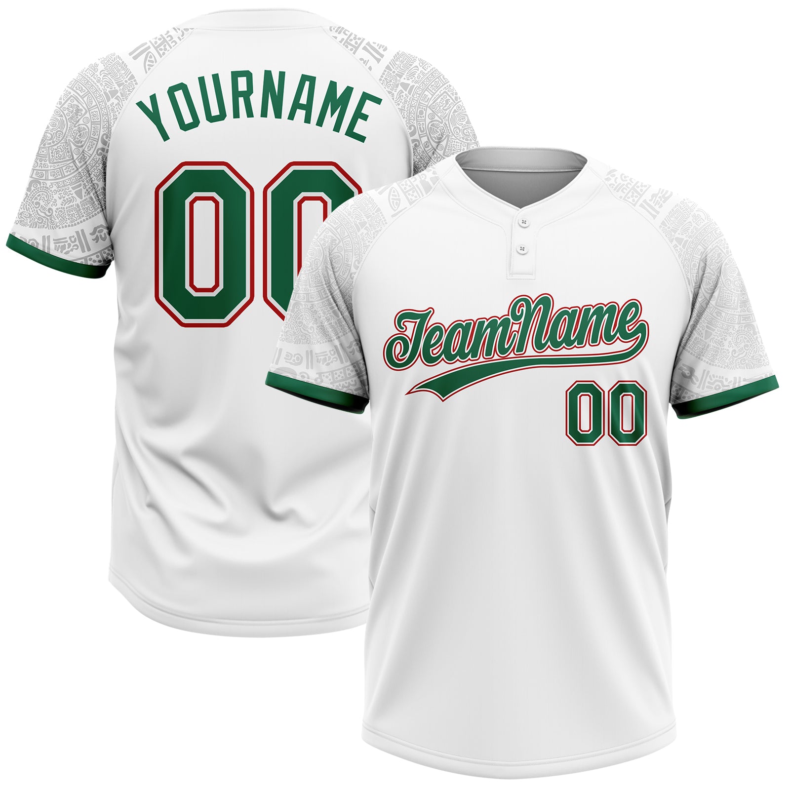 Custom White Kelly Green-Red Ethnic Aztec Mexican Heritage Two-Button Unisex Softball Jersey