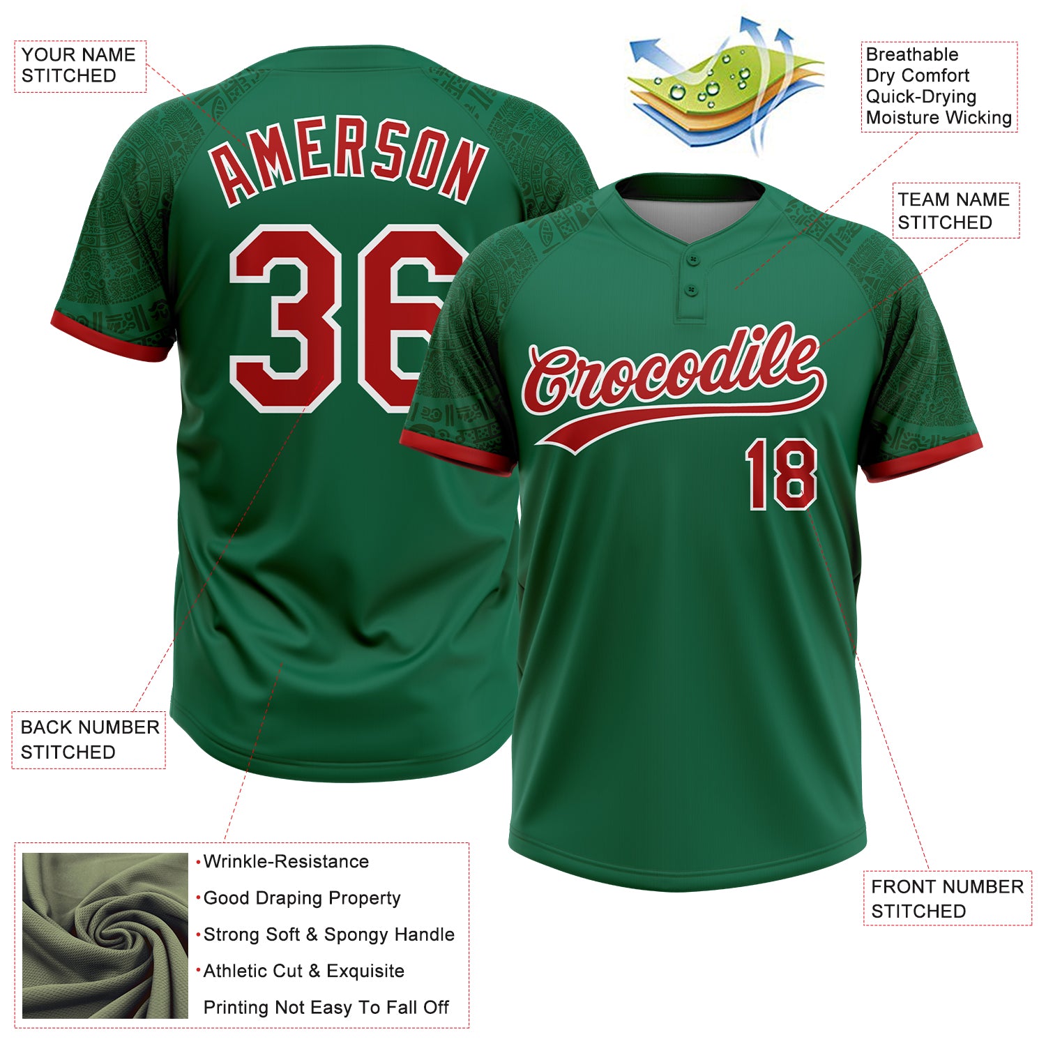 Custom Kelly Green Red-White Ethnic Aztec Mexican Heritage Two-Button Unisex Softball Jersey