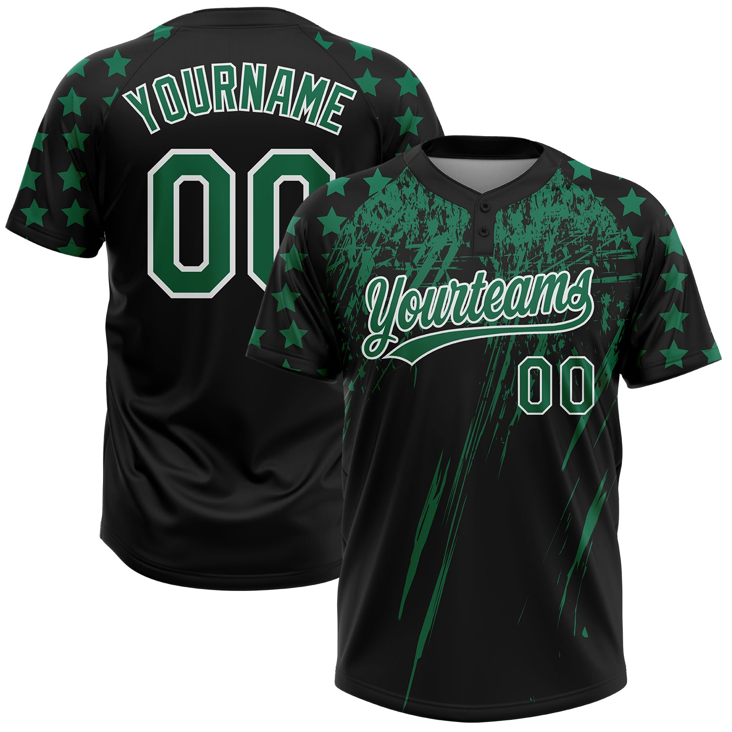 Custom Black Kelly Green-White Distressed Scratch Brush Stroke Star Raglan Sleeves Two-Button Unisex Softball Jersey