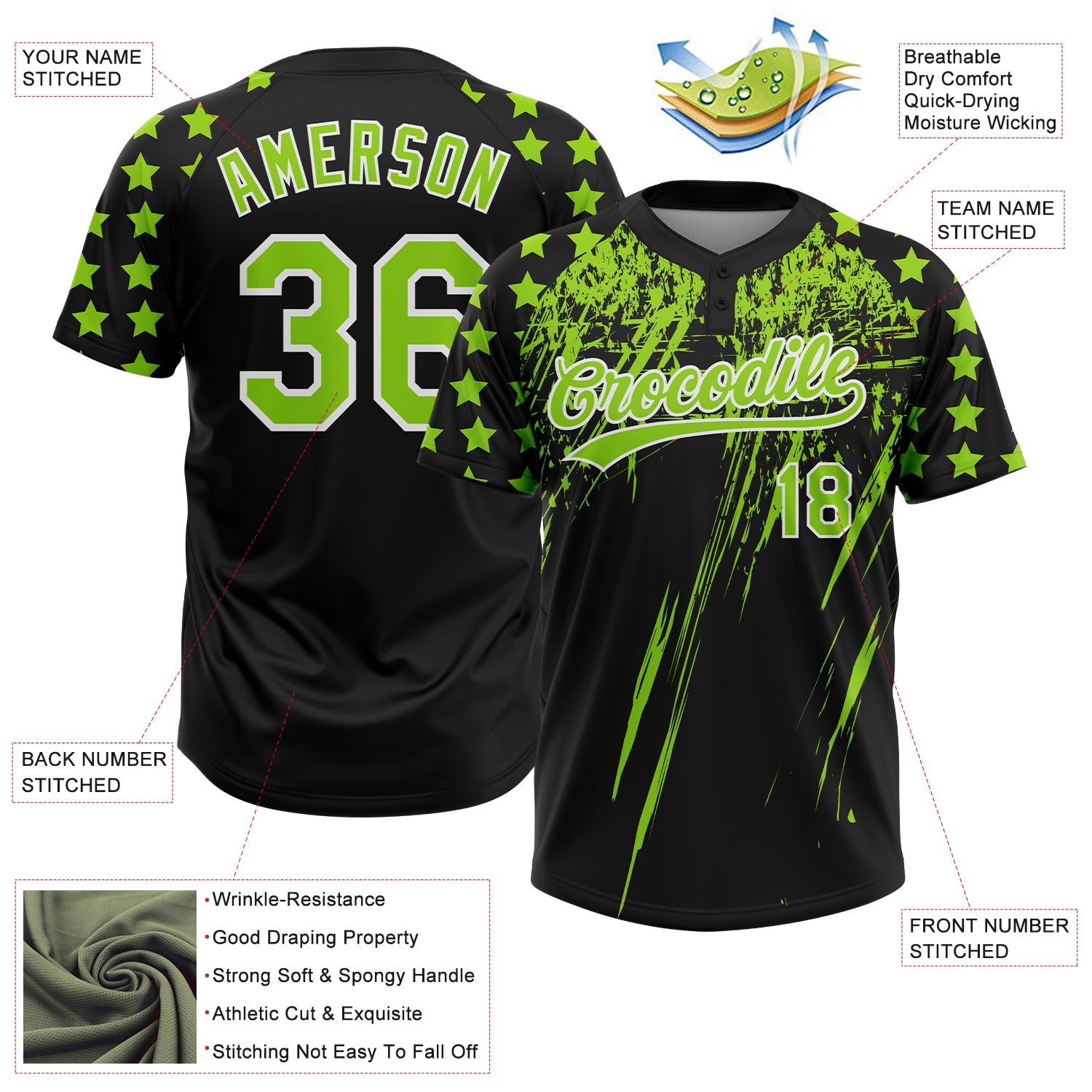 Custom Black Neon Green-White Distressed Scratch Brush Stroke Star Raglan Sleeves Two-Button Unisex Softball Jersey