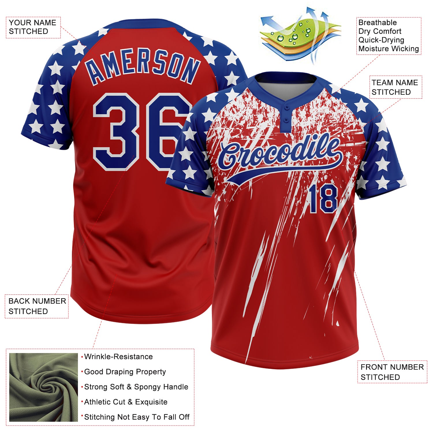 Custom Red Royal-White Distressed Scratch Brush Stroke Star Raglan Sleeves Two-Button Unisex Softball Jersey