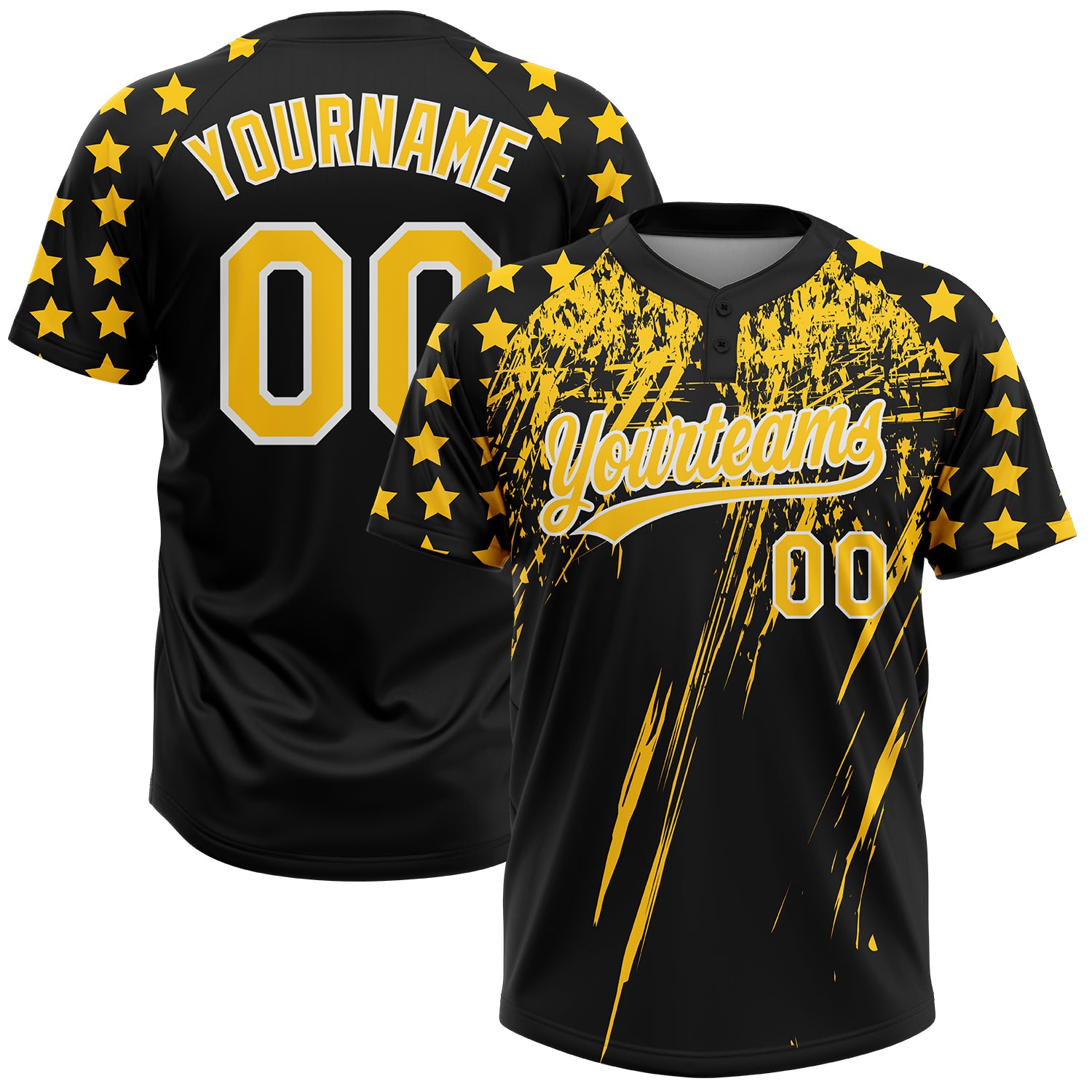 Custom Black Yellow-White Distressed Scratch Brush Stroke Star Raglan Sleeves Two-Button Unisex Softball Jersey