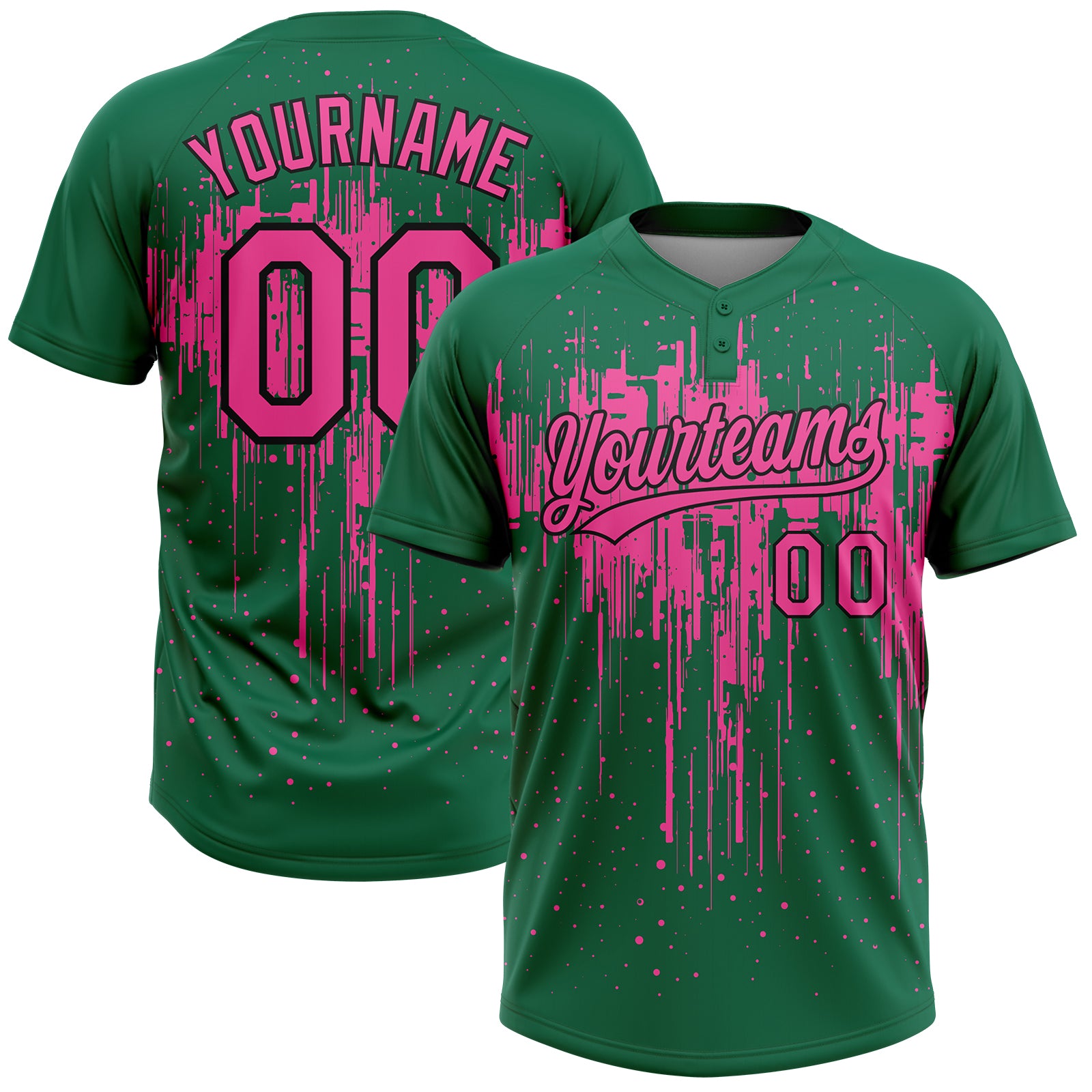 Custom Kelly Green Pink-Black Dripping Splatter Paint Two-Button Unisex Softball Jersey