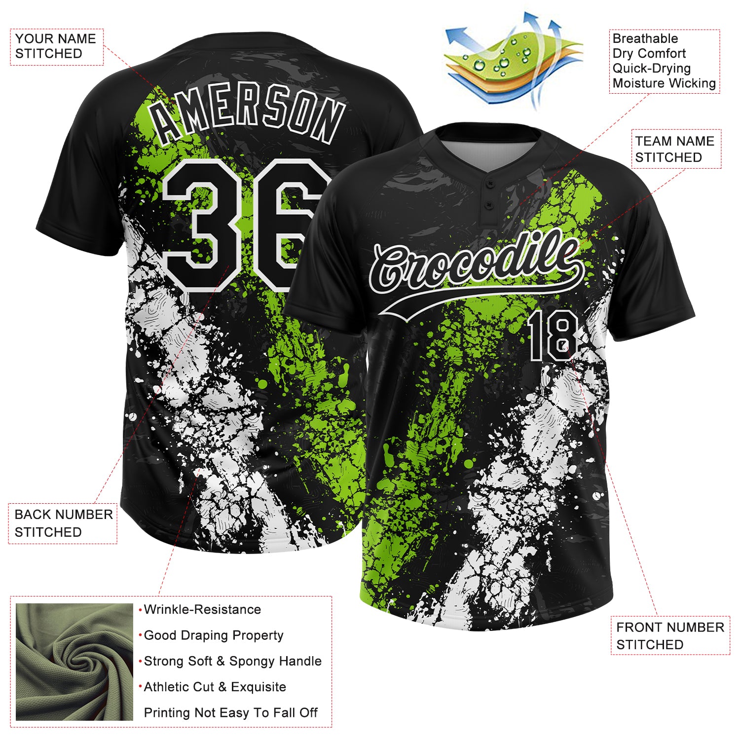 Custom Black Neon Green-White Dripping Splatter Cracked Texture Two-Button Unisex Softball Jersey