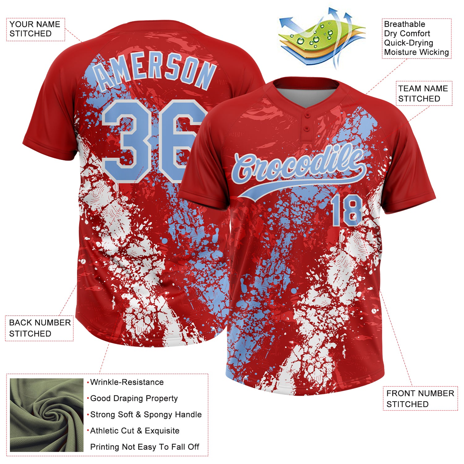 Custom Red Light Blue-White Dripping Splatter Cracked Texture Two-Button Unisex Softball Jersey