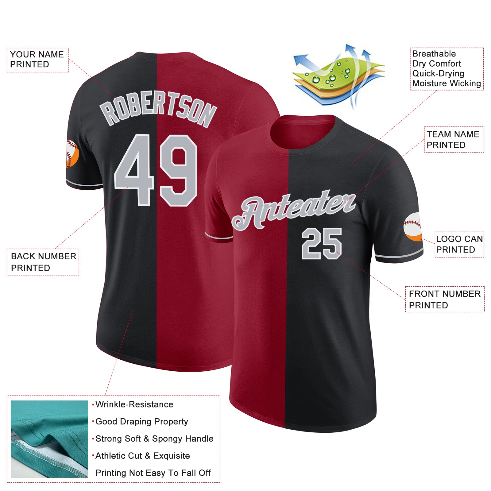 Custom Black Gray-Crimson Split Fashion Performance T-Shirt