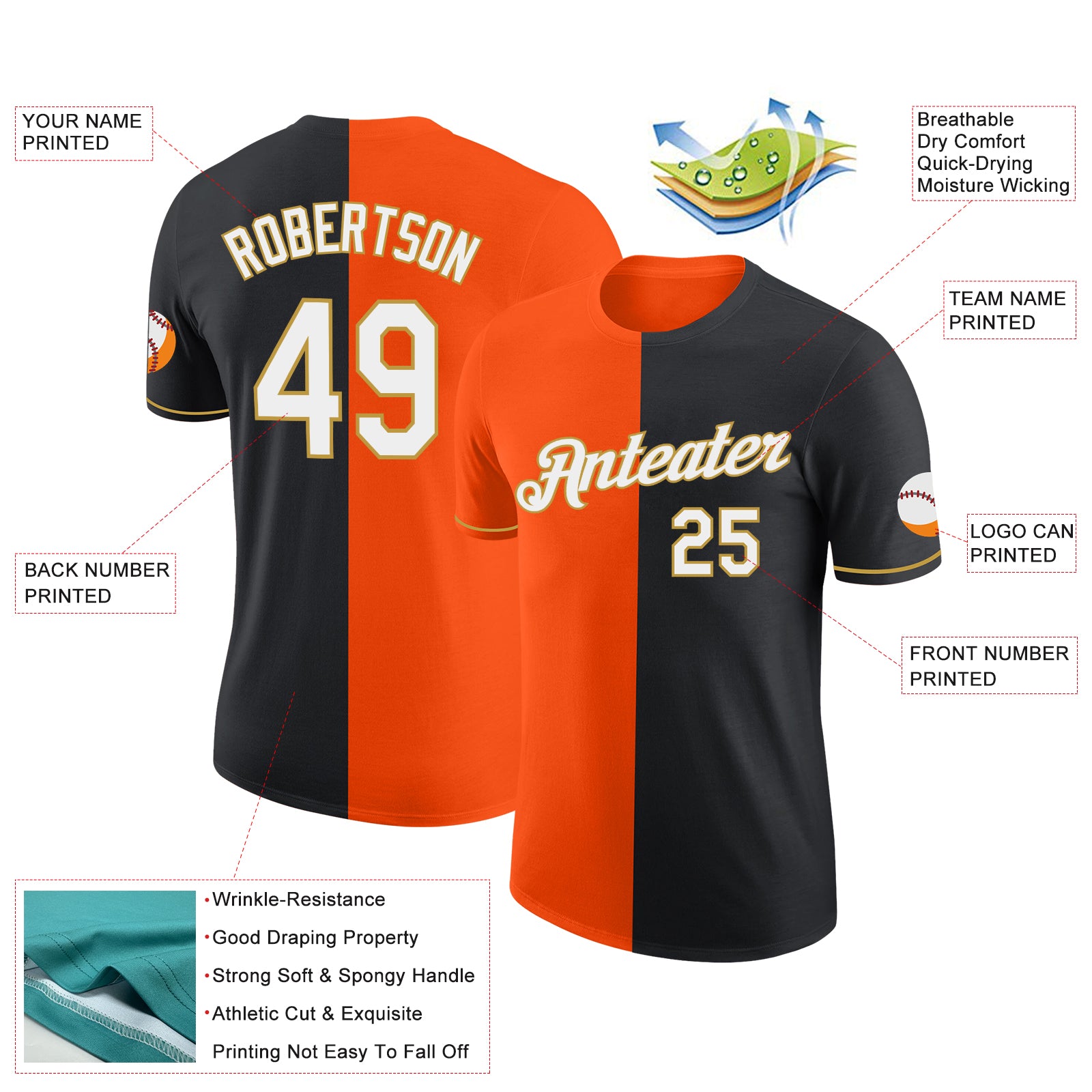Custom Black Orange-Old Gold Split Fashion Performance T-Shirt
