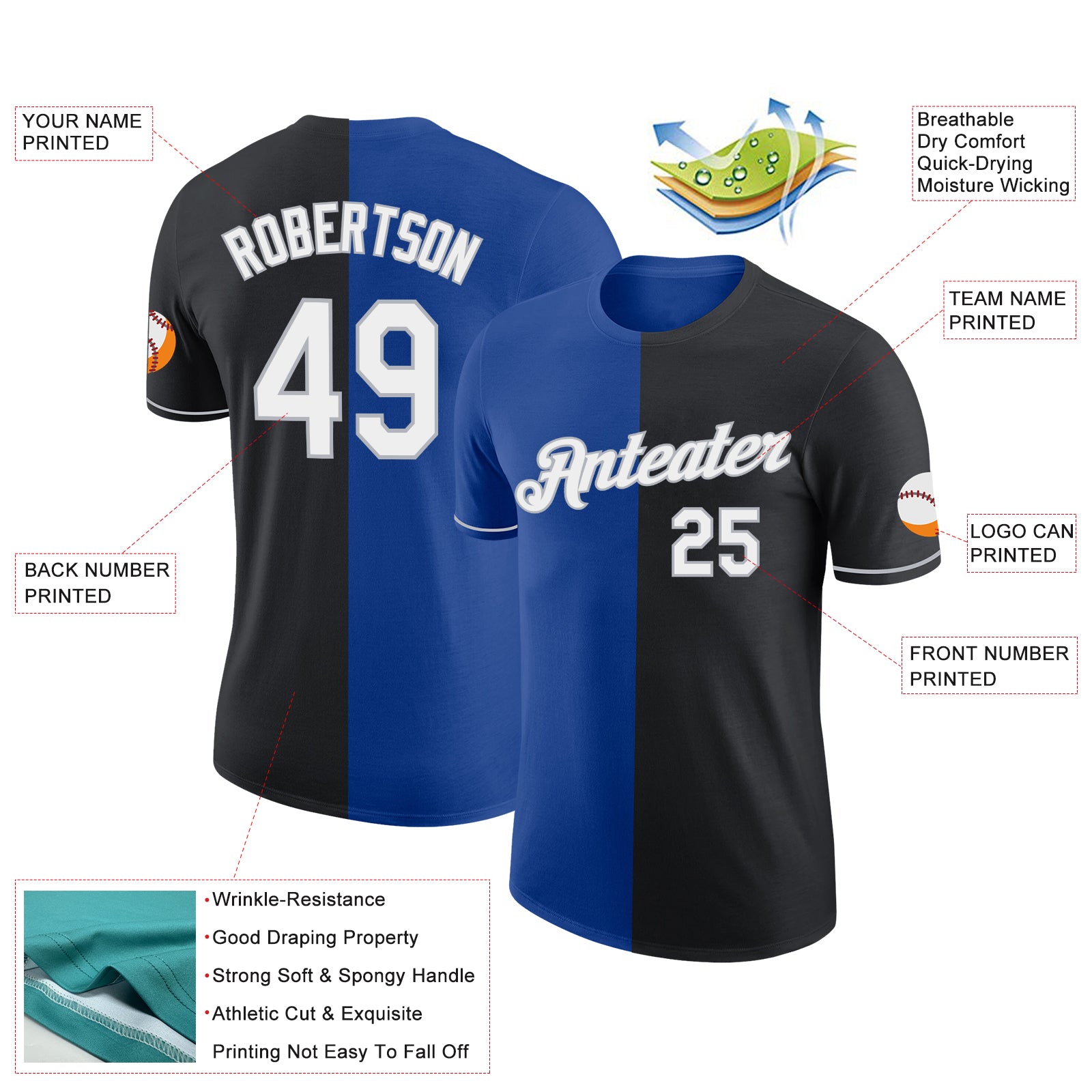 Custom Black Royal-Gray Split Fashion Performance T-Shirt