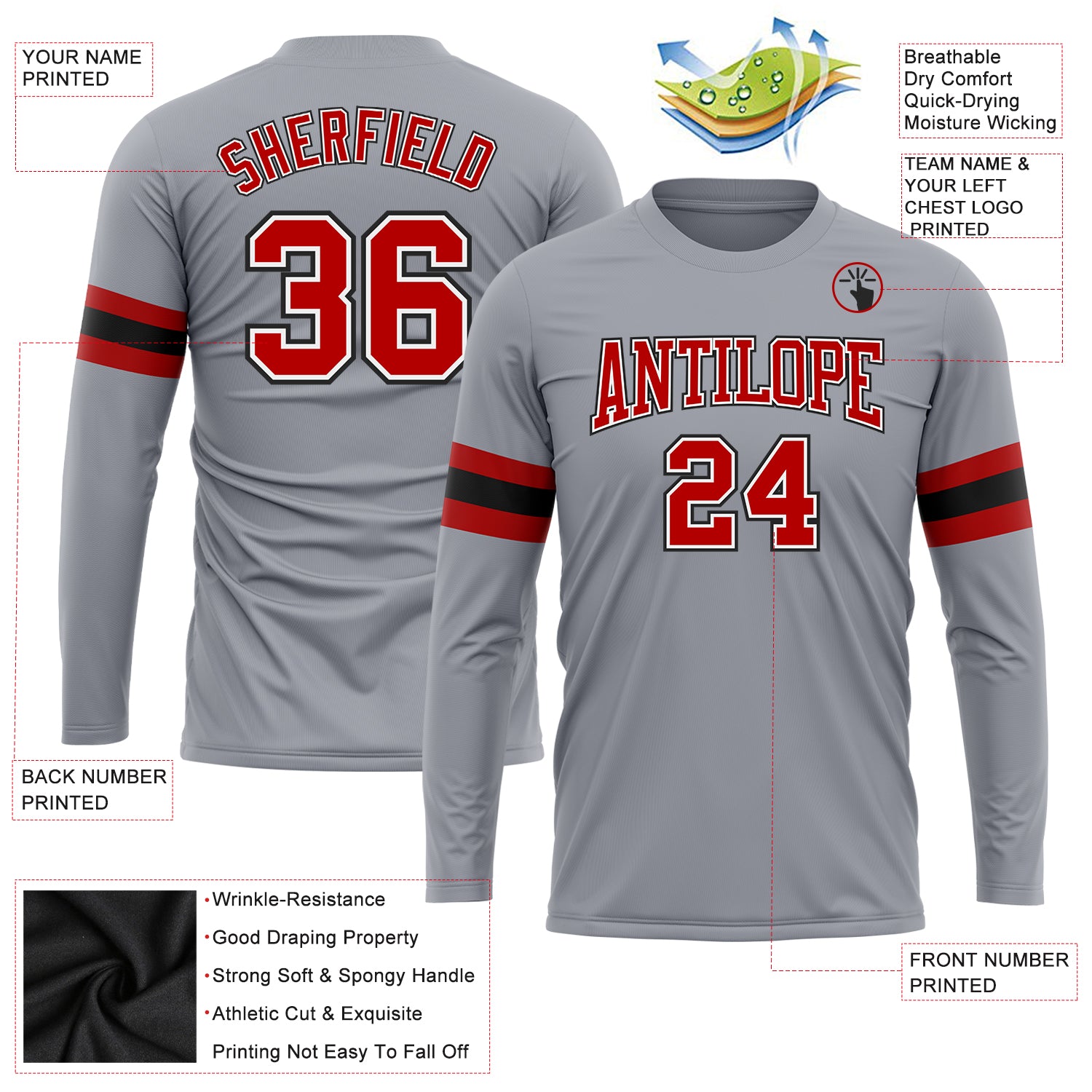 Custom Gray Red-Black Long Sleeve Performance T-Shirt