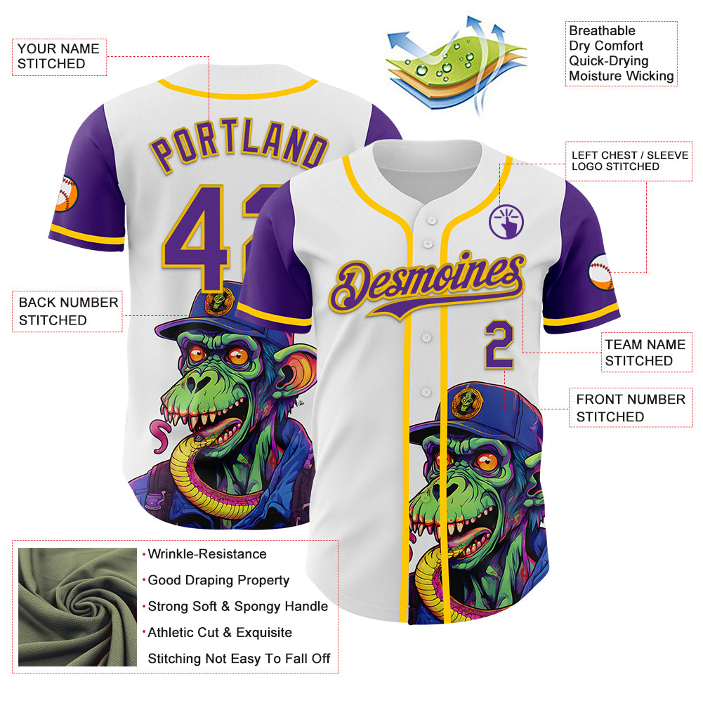 Custom White Purple-Yellow 3D Pattern Design Rave Monster Authentic Baseball Jersey